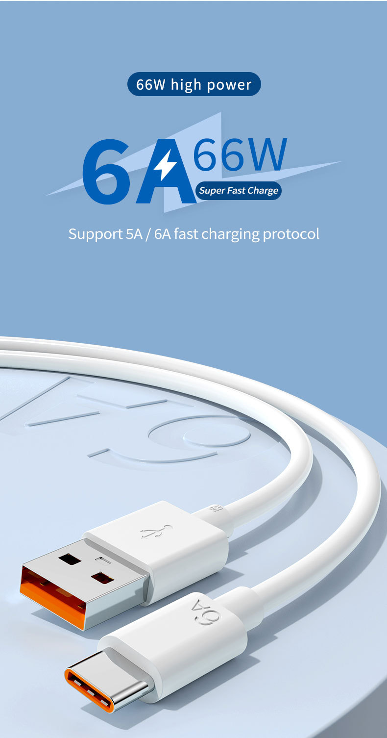 Супербыстрый USB-кабель 6A 66 Вт Тип C для Huawei Mate 40 50 Xiaomi 11 10 Pro OPPO R17