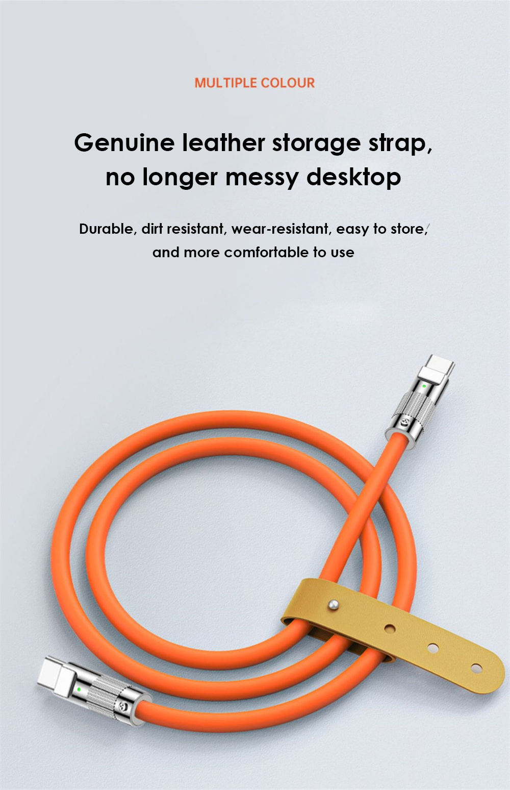 7. Зарядный Кабель оснащен кожаным ремешком для хранения, который устойчив к пятнам, прочен и износостойкий, а также удобен для хранения, так что на вашем рабочем столе больше не будет беспорядка.