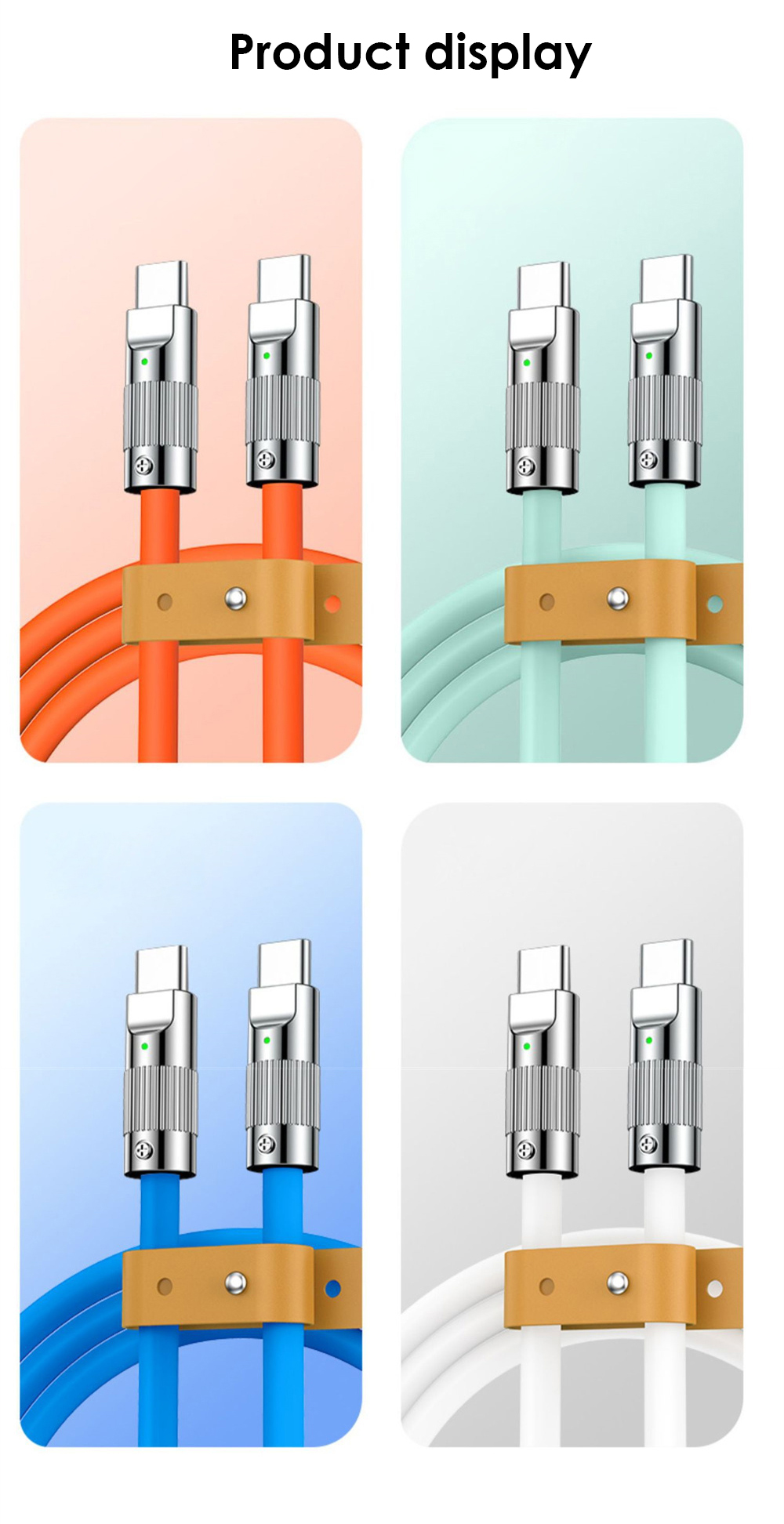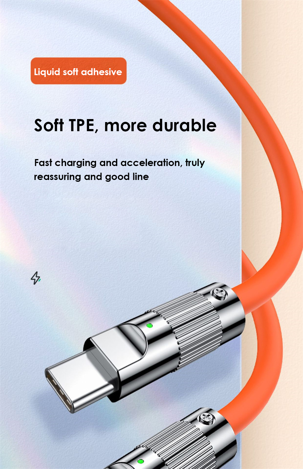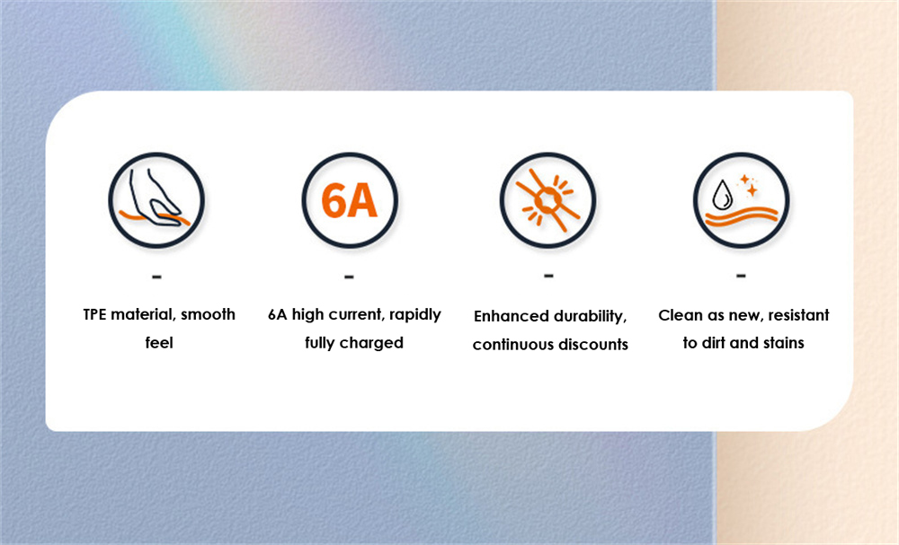 1. Двойной зарядный кабель Type-C на обоих концах, с использованием жидкого мягкого резинового материала, мягкий TPE более прочный, быстрая скорость зарядки, настоящее спокойствие, хорошая линия.
