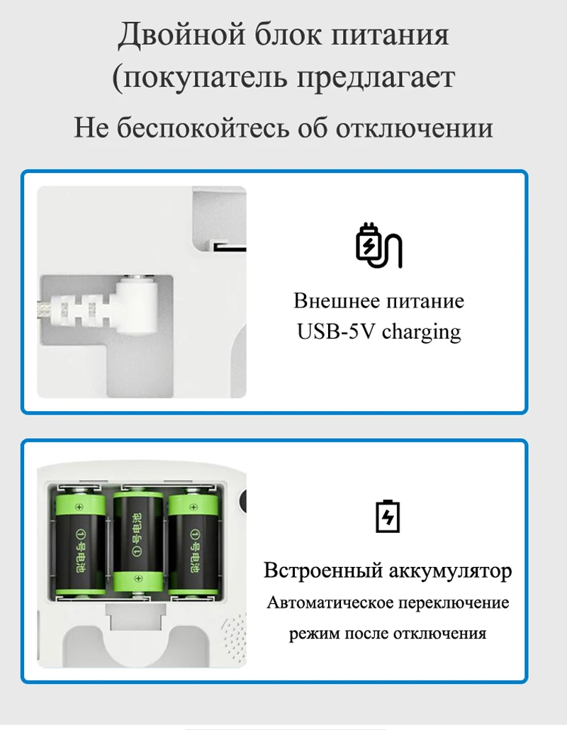 Используйте адаптер постоянного тока 5 В, поддерживая питание автоматической кормушки для кошек с помощью 3 щелочных батарей D-элементов (не входят в комплект), установленных на случай отключения электроэнергии, чтобы ваш питомец постоянно получал пищу.