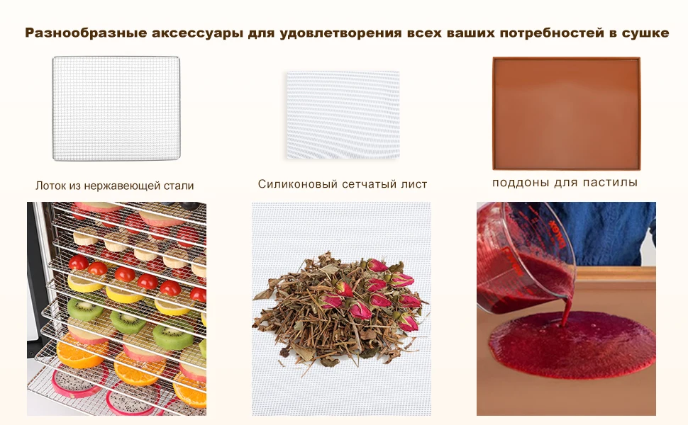 Металлический лоток изготовлен из пищевой нержавеющей стали, а сетчатая силиконовая прокладка и лоток для жидкости - из термостойкого пищевого силикона. В набор входят различные аксессуары, которые помогут вам сушить различные продукты.