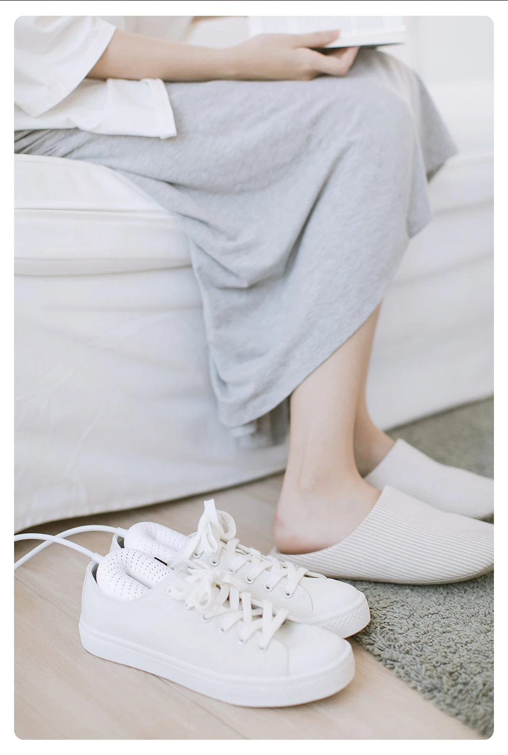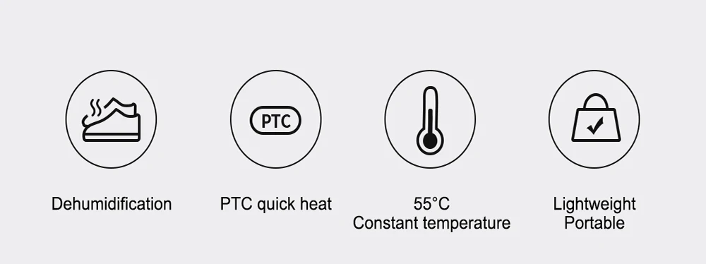 Каждая сушилка для обуви имеет два встроенных нагревательных элемента PTC, которые соответственно встроены в два конца кольца. Равномерно распределенное тепло быстро высыхает обувь, отводит влагу и дарит ощущение тепла и пушистого ношения.