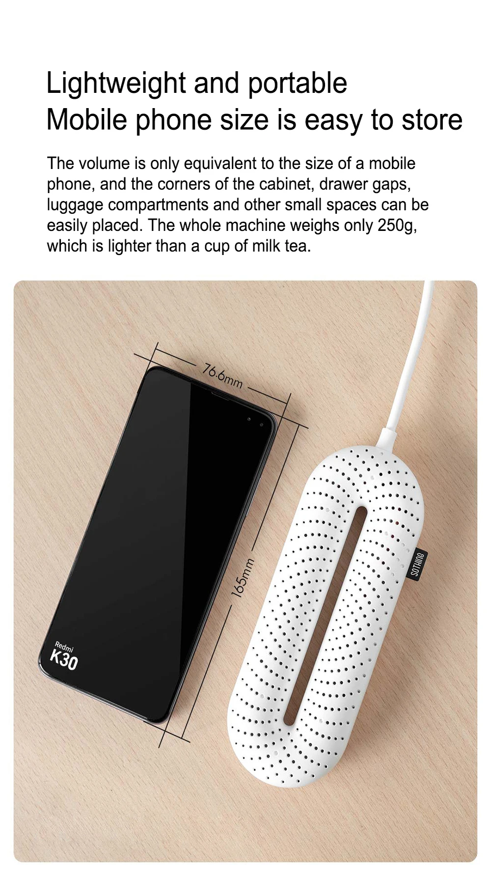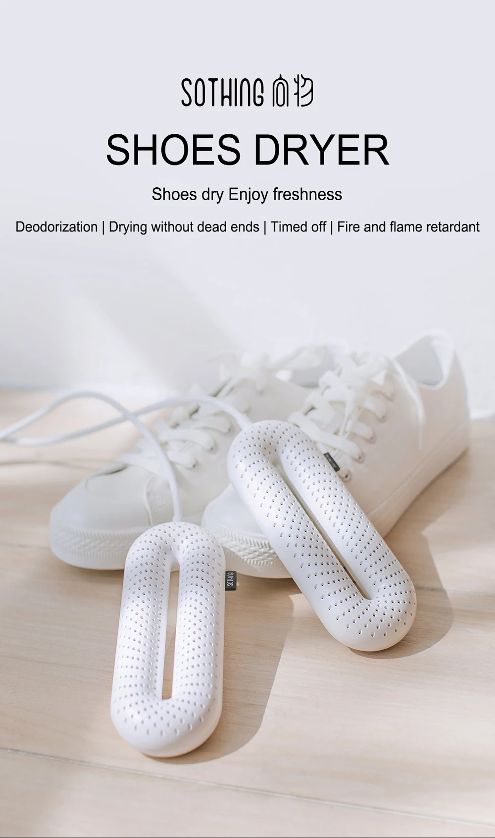 Поверхность продукта снабжена 1532 отверстиями для рассеивания тепла, равномерно заботясь о подошве и верхней части, формируя циркуляцию горячего воздуха в замкнутом пространстве обуви и равномерно сушивая всю обувь, включая мертвые углы пятки и носка.