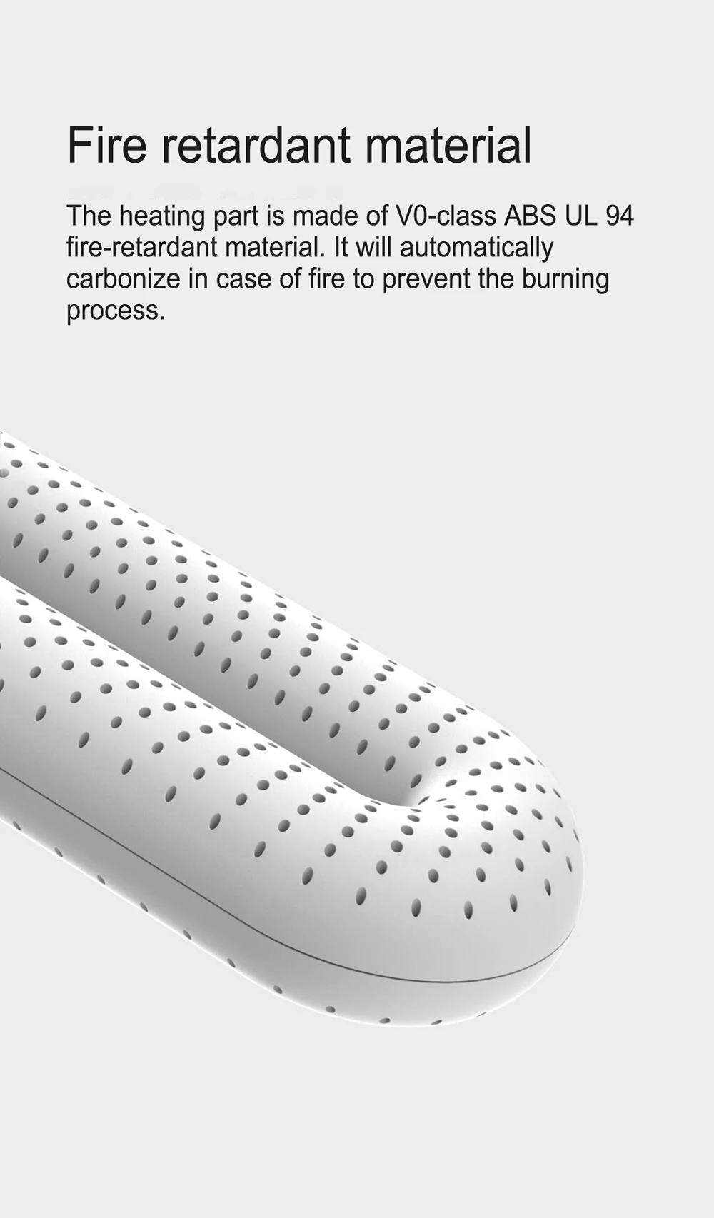 Нагревательная часть изготовлена из огнестойкого материала VO-class ABS UL 94, Чехол автоматически карбонизируется, чтобы предотвратить процесс горения.