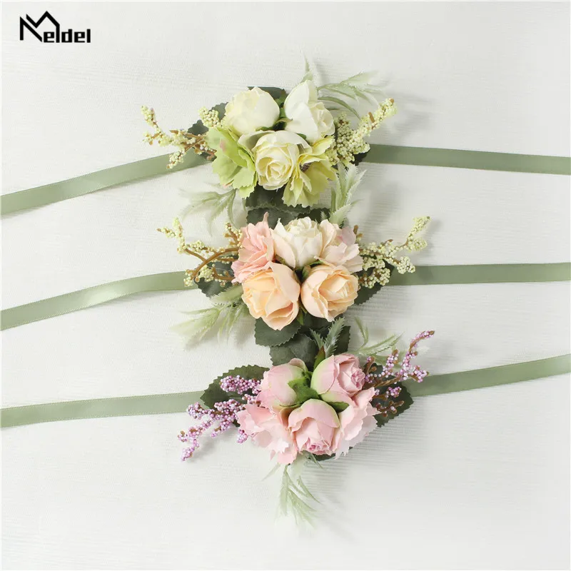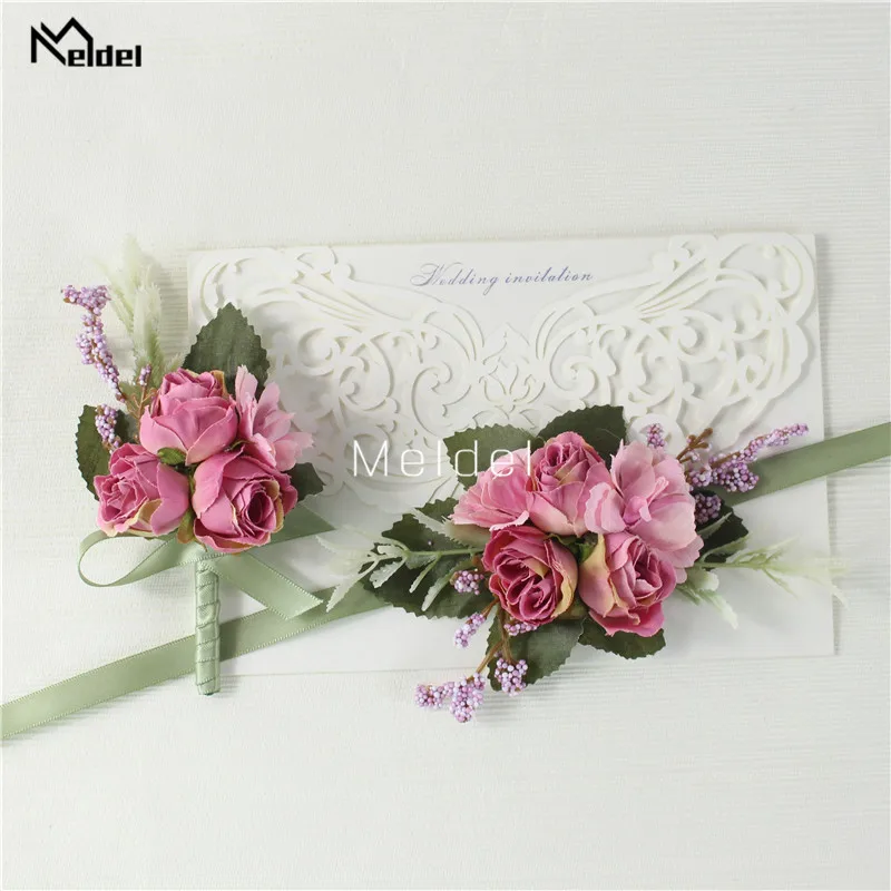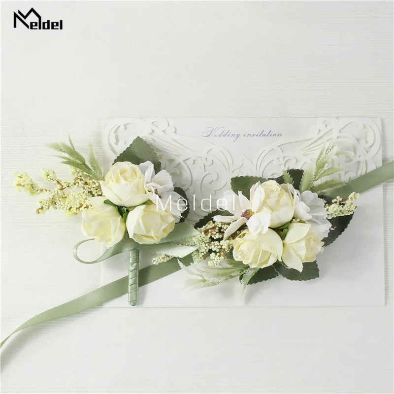 Meldel Wrist Corsage Wedding Men Boutonniere Girl Bracelet Groom Pins Bridesmaid Wrist Corsage Flower Silk Red Rose Boutonniere