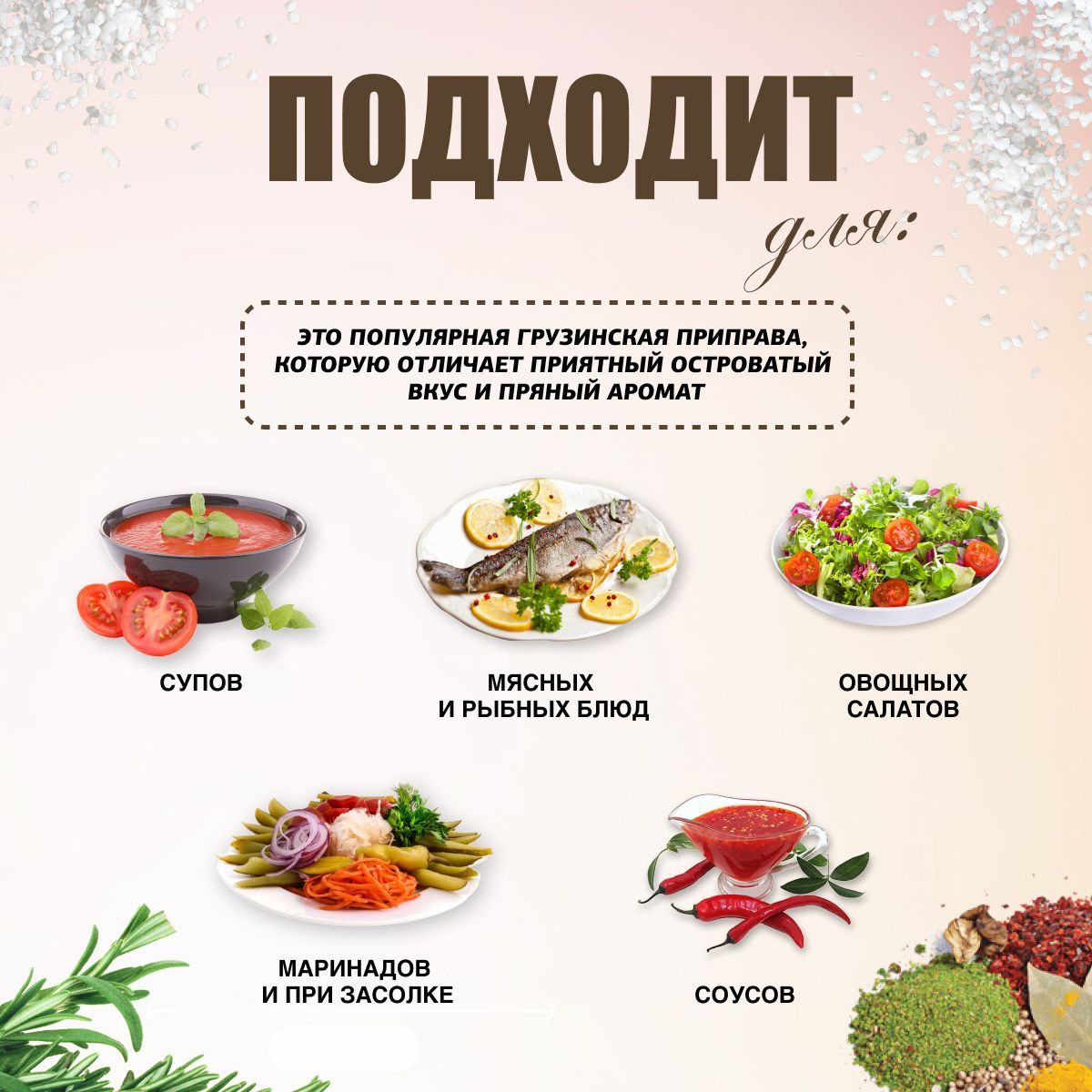 Приправа содержит множество полезных веществ, благоприятно влияет на пищеварение и укрепляет иммунитет. Идеально подходит к блюдам из птицы, яиц, картофеля. Применяется для приготовления первых блюд, соусов, пельменей, блюд из мяса и рыбы, маринадов и салатов.