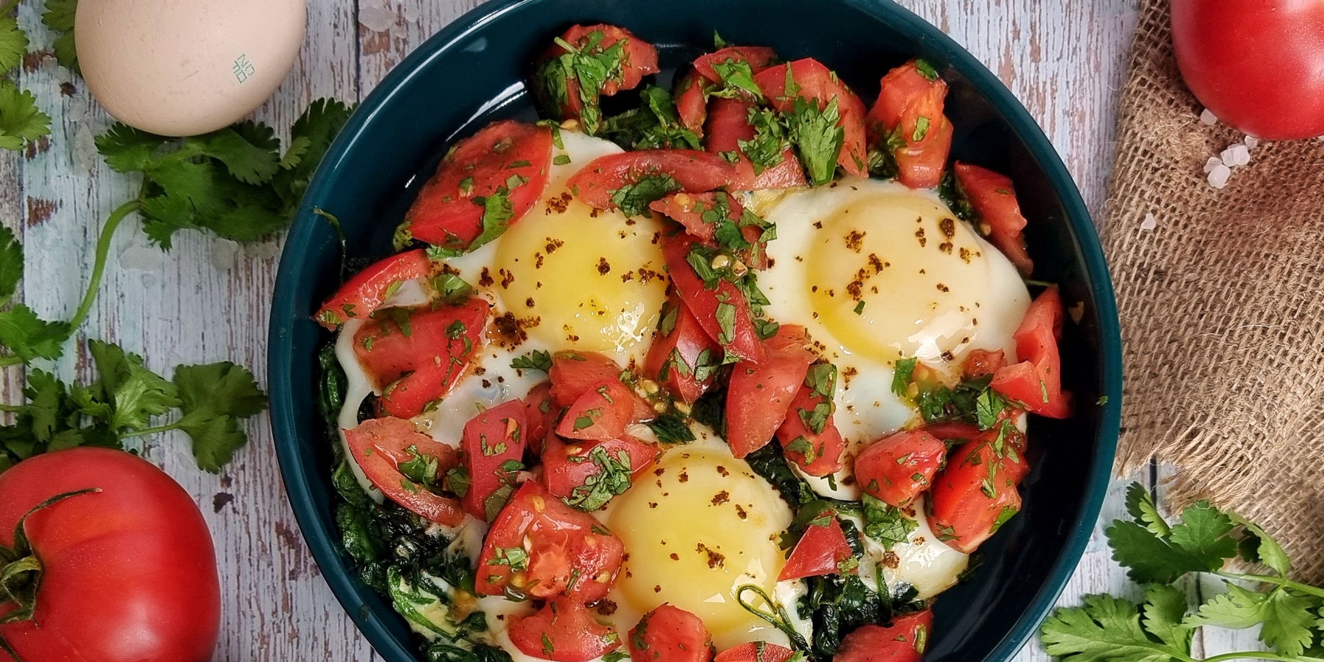 Щепотку сванской соли прогреть на сковороде, добавить оливковое масло и шпинат. Жарить на среднем огне две минуты, добавить измельченный чеснок и нарезанную петрушку. Распределить ровным слоем по сковороде, вбить яйца и готовить чтобы желток оставался жидким, а белок запекся.
