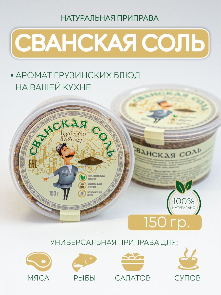 Описание: Сванская соль - это натуральная смесь специй родом из Грузии, которая сможет сделать вкусным любое блюдо! Универсальность этой приправы позволяет сочетать ее с разными продуктами: супом, курицей и мясом, грилем, фаршем, рыбой, салатами, добавлять в домашний хлеб, колбаски, бастурму и сыр. В составе заправки содержится йодированная пищевая соль, молотый чеснок, хмели-сунели, кориандр, острый красный перец, тмин и пажитник. Это природный усилитель вкуса, который поможет раззадорить аппетит во время еды и понравится всем без исключения! Специи идут в подарочной пластиковой баночке на 150 грамм и будет отличным презентом на 14 февраля и 8 марта маме, бабушке и жене. Приправы подойдут для вегетарианцев, приверженцев правильного питания и постящихся мужчин и женщин. Сушеные травы обладают множеством полезных свойств: нормализуют пищеварение, оказывают антибактериальное действие и уменьшают воспалительные процессы. Крупная соль подойдет для блюд всех кухонь мира: армянской, итальянской, узбекской, турецкой и других. Ваша домашняя кухня приобретет замечательный вкус и аромат - ведь наш рецепт впитал в себя всю пользу и опыт наших предков, поэтому с каждым поколением он становится всё вкуснее и вкуснее!