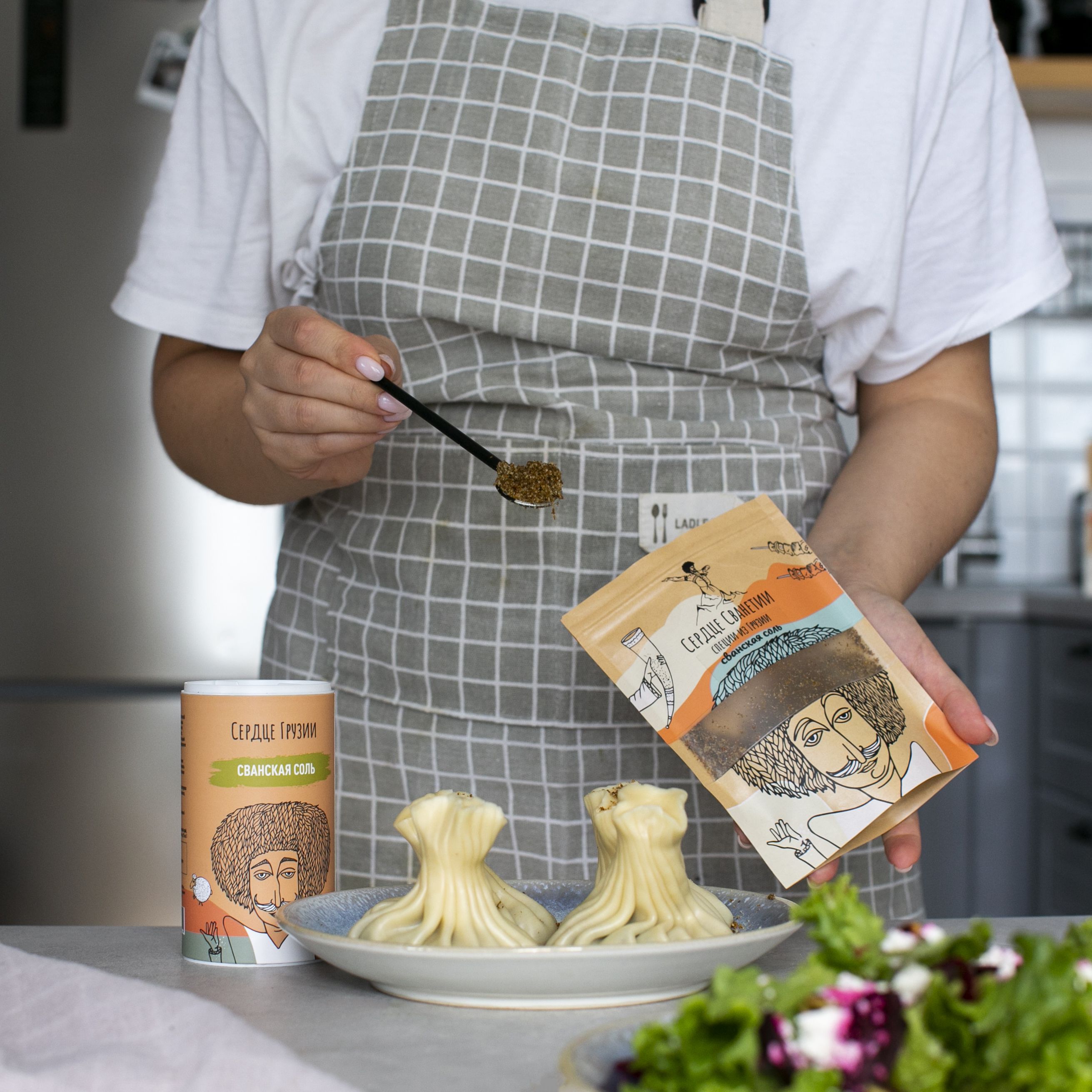 Соль, чеснок, кориандр, уцхо-сунели, петрушка молотая, бархатцы, кондари молотый, зира молотая, красный перец