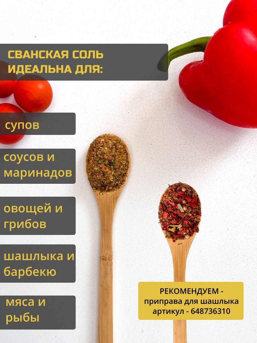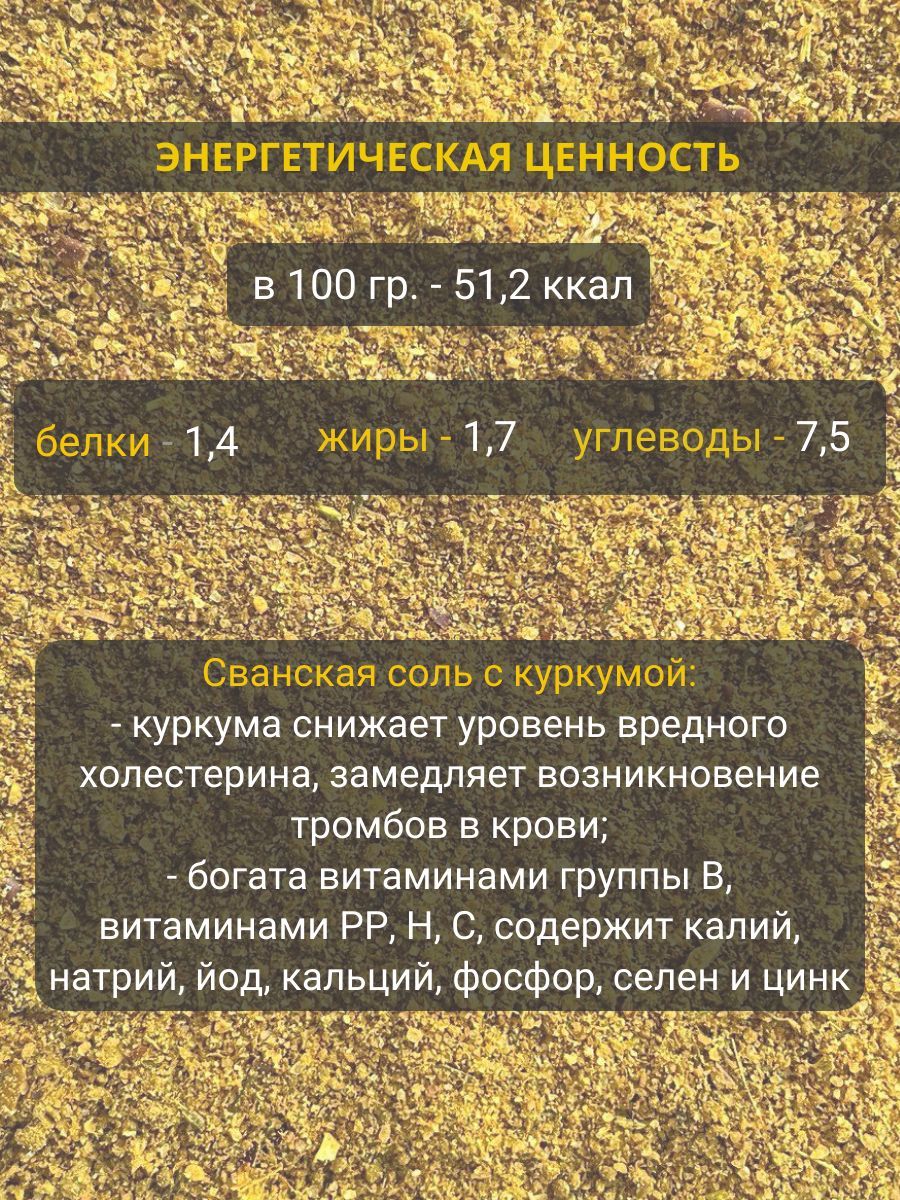 Описание: Сванская соль с куркумой- идеально дополнит мясные, рыбные блюда, супы и соусы;