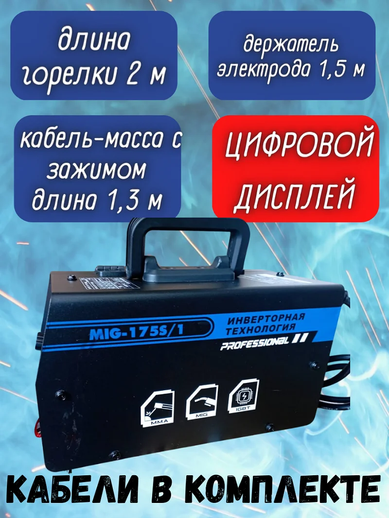 Диаметр электродов - 2.0 - 4.0 мм Диаметр проволоки - 0.8 - 1.0 мм Длина сетевого кабеля - 1,5 м