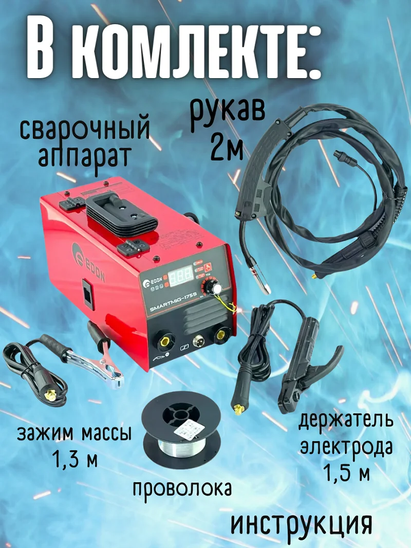 Современный цифровой безгазовый полуавтомат Edon Smart MIG-175S предназначен для полуавтоматической безгазовой сварки самозащитной (порошковой) проволокой 0.8-1.0 мм., и дуговой сварки штучным электродом 1.6 до 4.0 мм.