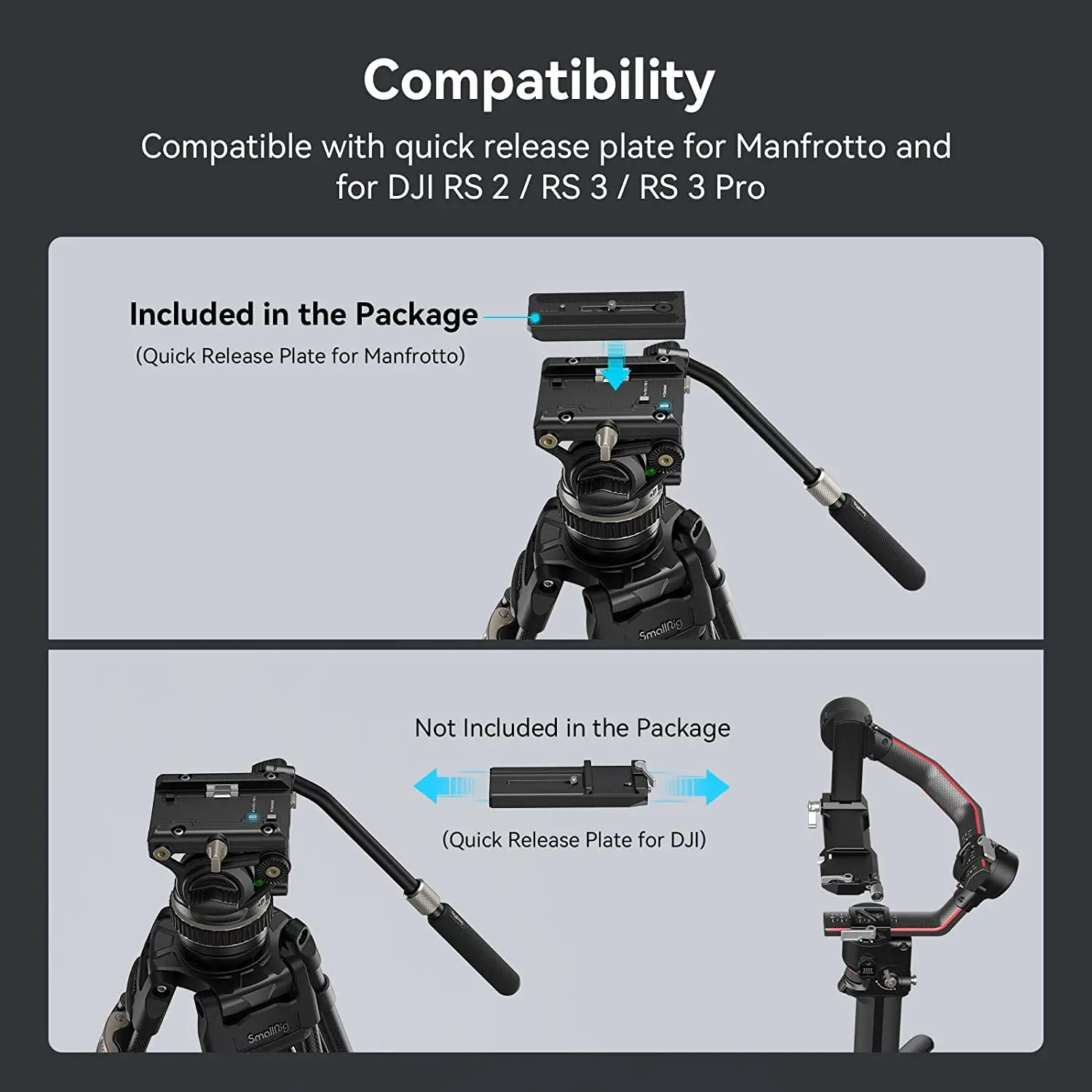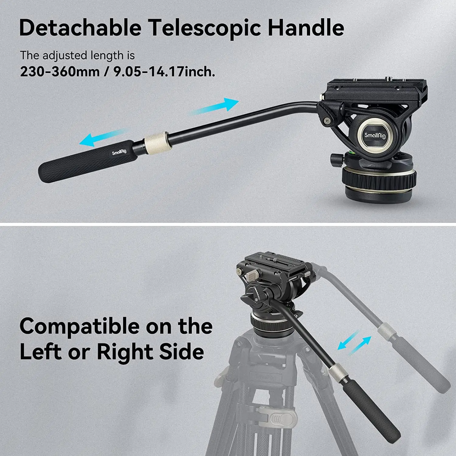 Видеоголовка SmallRig для тяжелых условий эксплуатации 4165Это Профессиональная жидкая головка для облегчения видеосъемки. Видеоголовка с регулируемой бесступенчатой системой демпфирования позволяет плавно панорамировать камеру с различной скоростью, которую вы желаете. Когда высота центра тяжести установлена на 55 мм, система противовеса панорамирования и наклона может помочь точно управлять камерой или другими установками весом до 8 кг для отличного динамического баланса. Видеоголовка может нести до 10 кг. Он имеет недавно разработанное быстросъемное крепление для пластины с защелкой, более эффективное решение для монтажа, чем традиционные скользящие, это быстросъемная пластина DJI RS 2 / RS 3 / RS 3 Pro и быстросъемная пластина Manfrotto, совместимая с возможностью свободного переключения между съемкой со стабилизатором и съемкой со штативом. Имеется съемная телескопическая ручка для удобного хранения и эксплуатации, она подходит как для левшей, так и для правшей. Видеоголовка также имеет одно отверстие с резьбой 1/4 "-20 для поддержки Волшебной руки и других аксессуаров, а также встроенный гаечный ключ для установки и освобождения камеры.