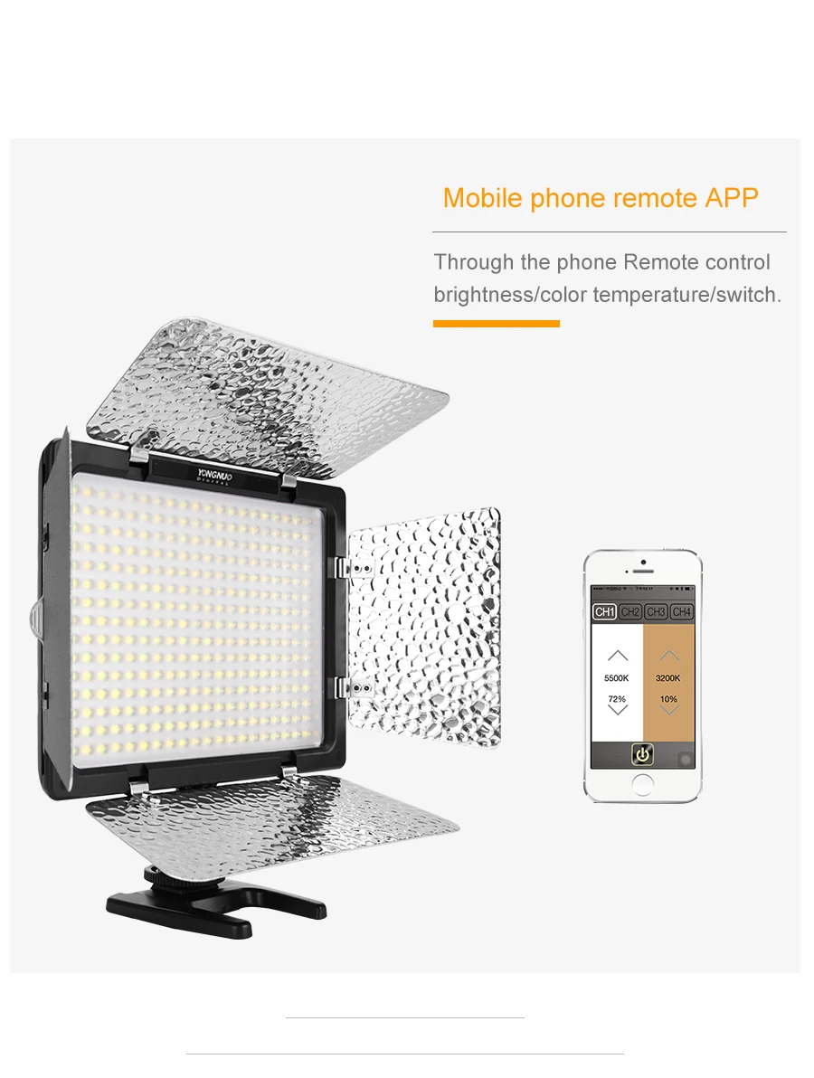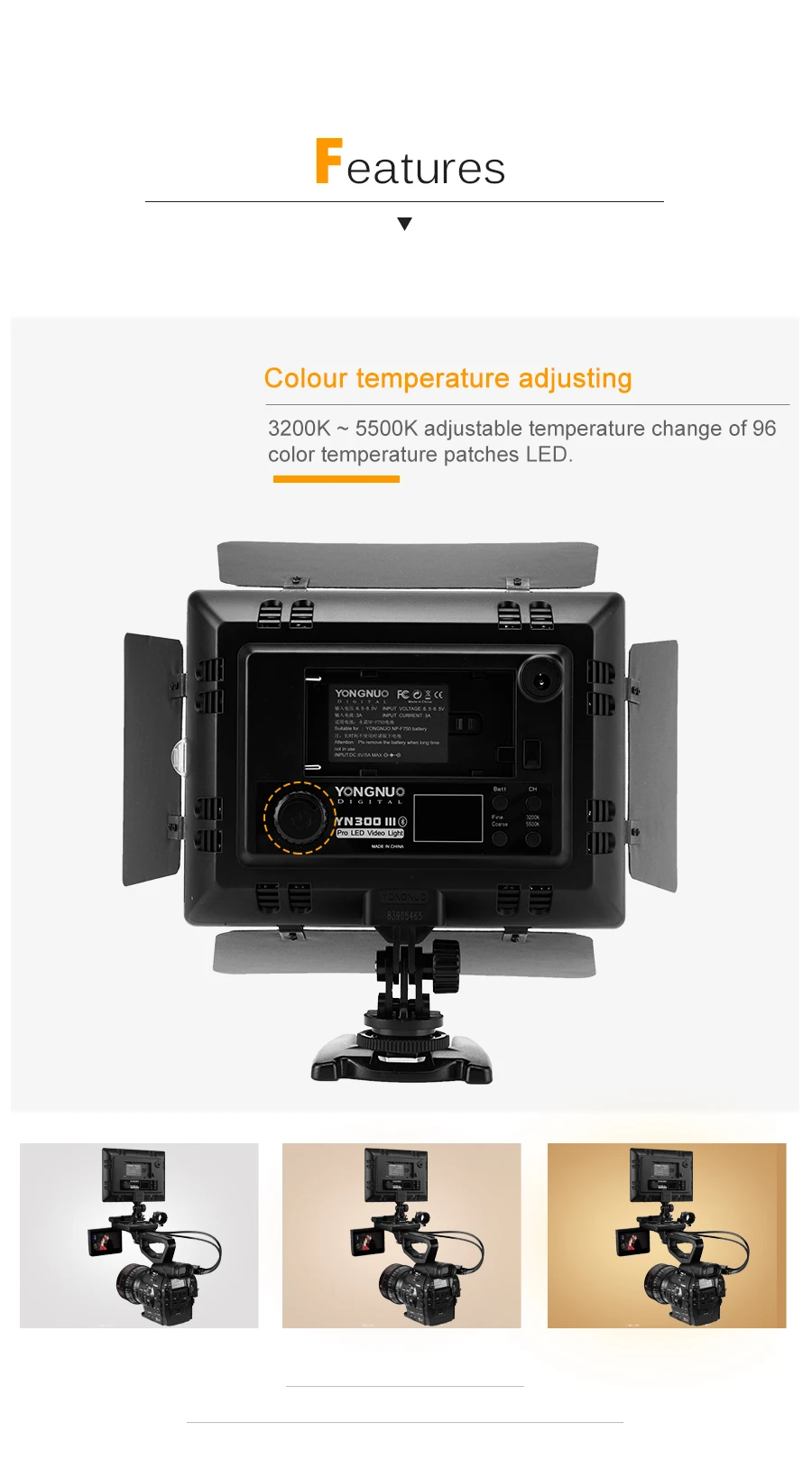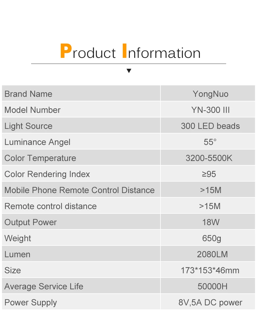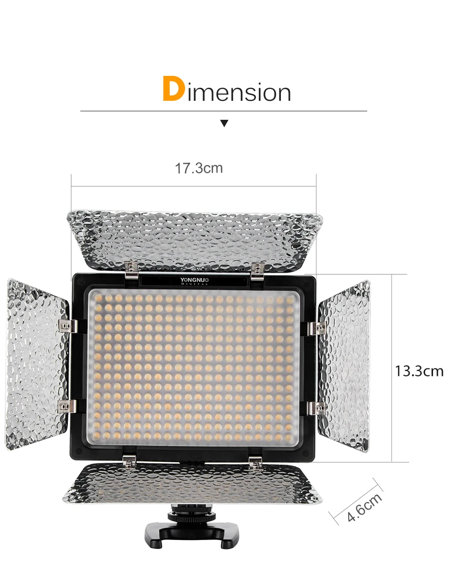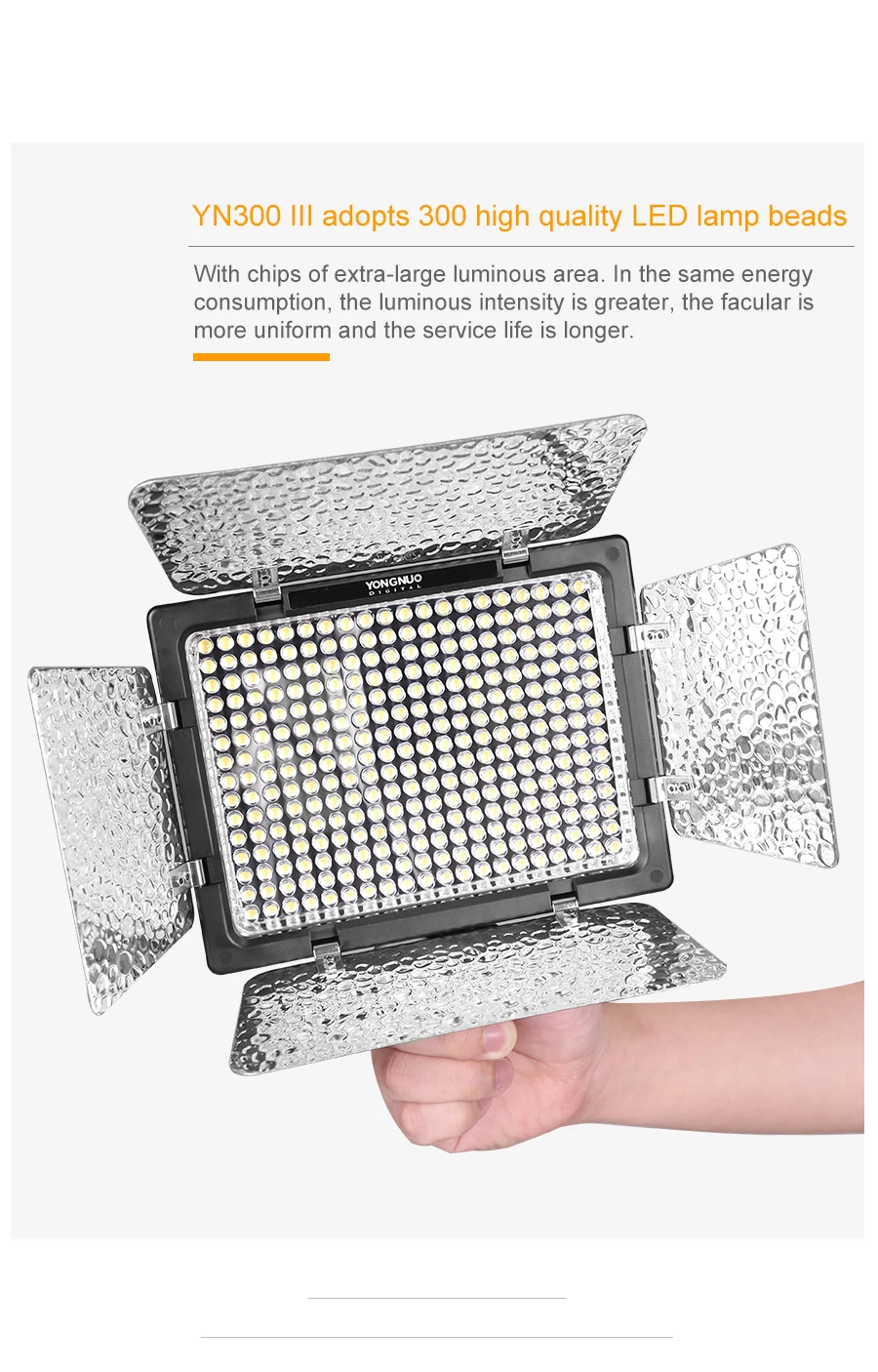 3.YN300 III состоит из 150 светодиодный ламповых бусин с цветовой температурой 3200k и еще 150 светодиодный ламповых бусин с цветовой температурой 5500k, которые являются высококачественными ламповыми бусинами сверхбольших светящихся чипов, С более высокой яркостью в одинаковом энергопотреблении. Цветовая температура может быть скорректирована с 3200-5500K по мере необходимости, с более практичным использованием.