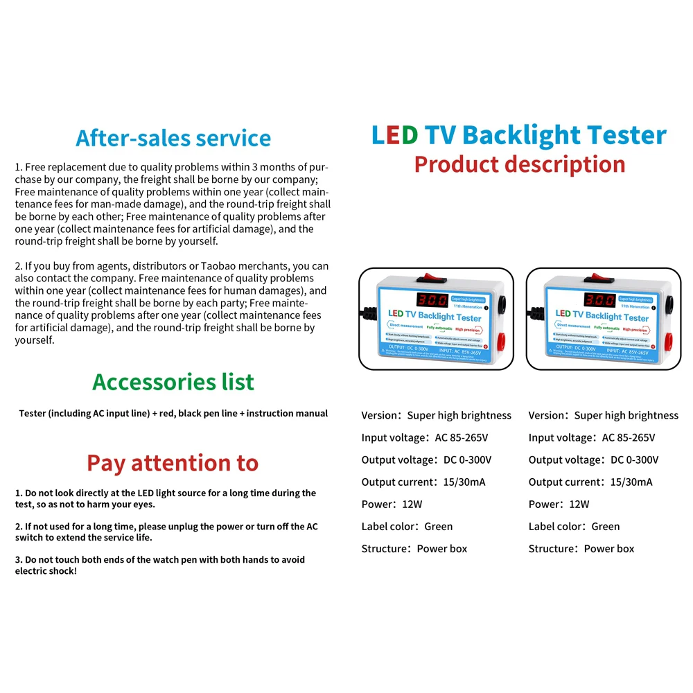 Автоматическое определение выходного напряжения и тока. Можно проверить светодиодную подсветку и световые Бусины любого размера. Высокая яркость, нет необходимости снимать экран, можно судить о качестве подсветки.