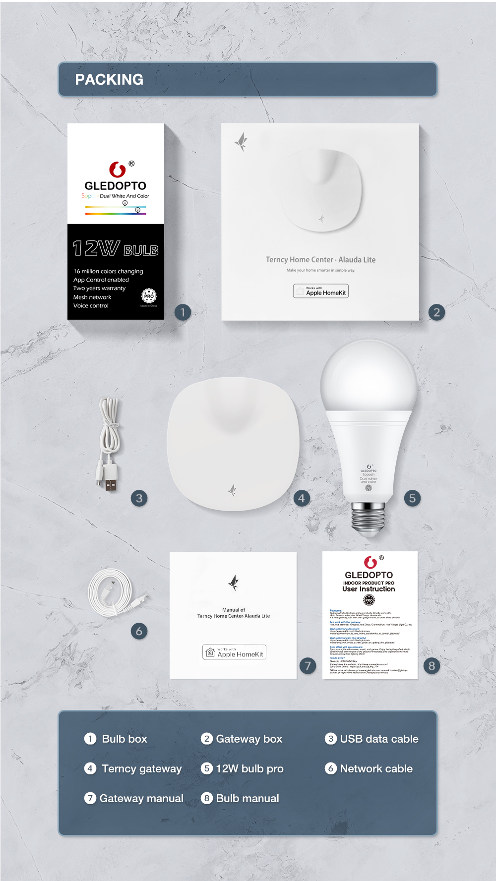 Примечание: Terncy Home Center использует личный протокол, совместим только с некоторыми продуктами zigbee. Zigbee беспроводное соединение с хабом HomeKit: Поддержка подключения к устройству 50 шт., очень подходит для умного домашнего управления; Работа с Amazon Alexa/Google Home/Apple TV/Apple Homepod/Apple App для голосового управления; Напрямую Управляйте с помощью приложения Apple Home. Gledopto + Terncy + домашний комплект Подготовка Пожалуйста, следуйте инструкциям пользователя Terncy Home Center Manualto сопряжение Terncy Home Center с Apple Homekit. Добавить автоматически 1. Убедитесь, что светильник Gledopto, который вы хотите добавить, не был добавлен к любому мосту zigbee. 2. Питание на светильник Gledopto zigbee. 3. Откройте меню приложения Terncy и нажмите «аксессуар» и нажмите «+», чтобы добавить новый светильник. 4. Успешно добавили свет, и свет должен быть обновлен к вашему приложению Apple Homekit автоматически. В & A или более подробную информацию, пожалуйста, перейдите к: https://www.reddit.com/r/Gledopto/ Название продукта: 12 Вт RGB + двойной белый светодиодный светильник Pro и Terncy Home Center Номер модели: GL-B-008P/Terncy-GW-02 Мощность: 12 Вт Материал: алюминий Напряжение: 100-240 В Срок службы: 50 000 часов Максимальный диаметр: 70 мм Максимальная длина: 147 мм Цветовая температура: 2000-6500K Световой поток: 900LM-110LM CRI: >801 шт terncy шлюз 1 шт. 12 Вт лампочка Pro 1 шт. сетевой кабель 1 шт. usb-кабель для передачи данных 1 шт. руководство шлюза 1 шт. руководство лампы 1 шт. лампа в коробке 1 шт. шлюз коробка