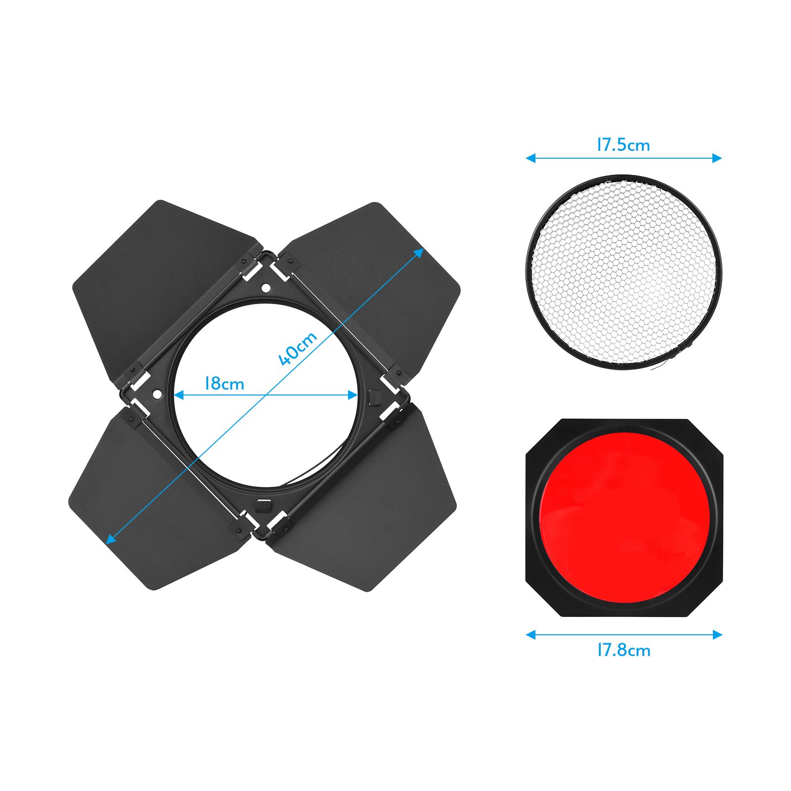 Комплект двери сарая можно установить на стандартный 7-дюймовый отражатель. С 4 листами для гибкого формирования освещения. Свет можно сконцентрировать по необходимости.