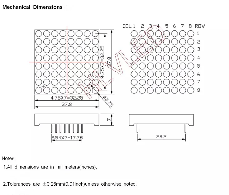1. Точечная Матрица 8*8; 2. Размер точки: 3,75 мм; 3. Цвет излучения: белый; 4. Цвет линз: черный и желтый; 5. Тип: общий анод; 6. Соответствует RoHS.