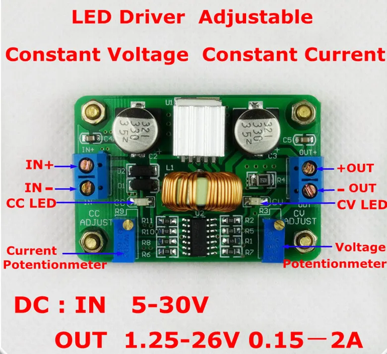 • Выходное напряжение:1,25-26 В (понижающий режим, входы должны быть больше, чем выходное напряжение выше 2 В)