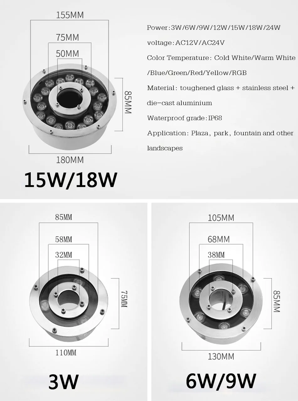 Светодиодный фонарь для фонтана, светильник водонепроницаемый подводсветильник светильник для бассейна, степень защиты Ip68, 3 Вт, 6 Вт, 9 Вт, 12 Вт, 15 Вт, 18 Вт, 24 Вт, 12 В переменного тока