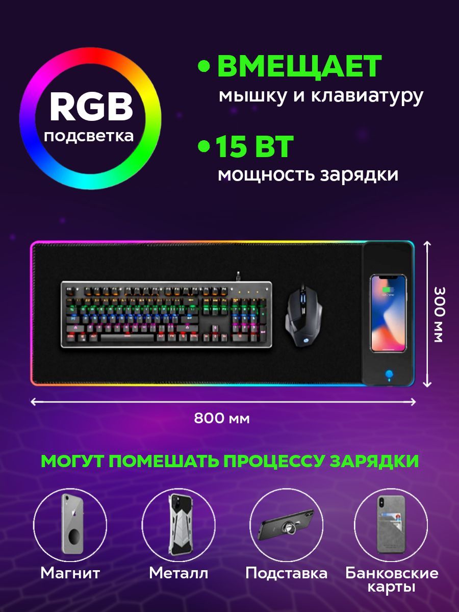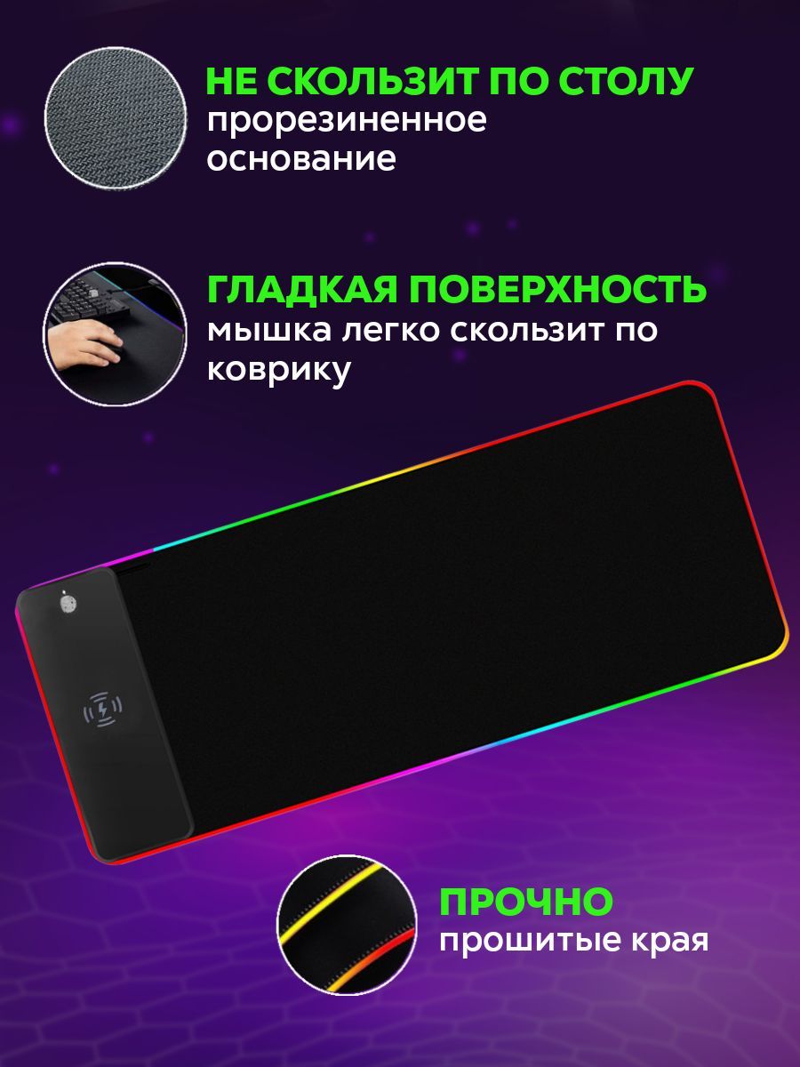 Светодиодный геймерский игровой коврик для мыши с беспроводной зарядкой, черный, 80х30 см, 10 режимов RGB подсветки