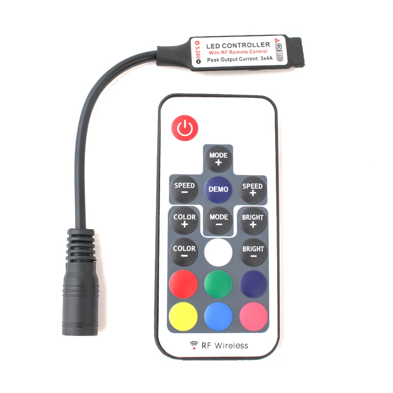 Это светодиодный мини-контроллер RGB в сочетании с 17 -Кнопка RF контроллера. Вам будет удобнее управлять полосками, так как мини-контроллер легко скрывается, и радиочастотный Контролер может пройти через battier и получить большое расстояние управления линзами и управление линзами радиус действия, так как при эксплуатации не требуется настраивать на Главный блок.