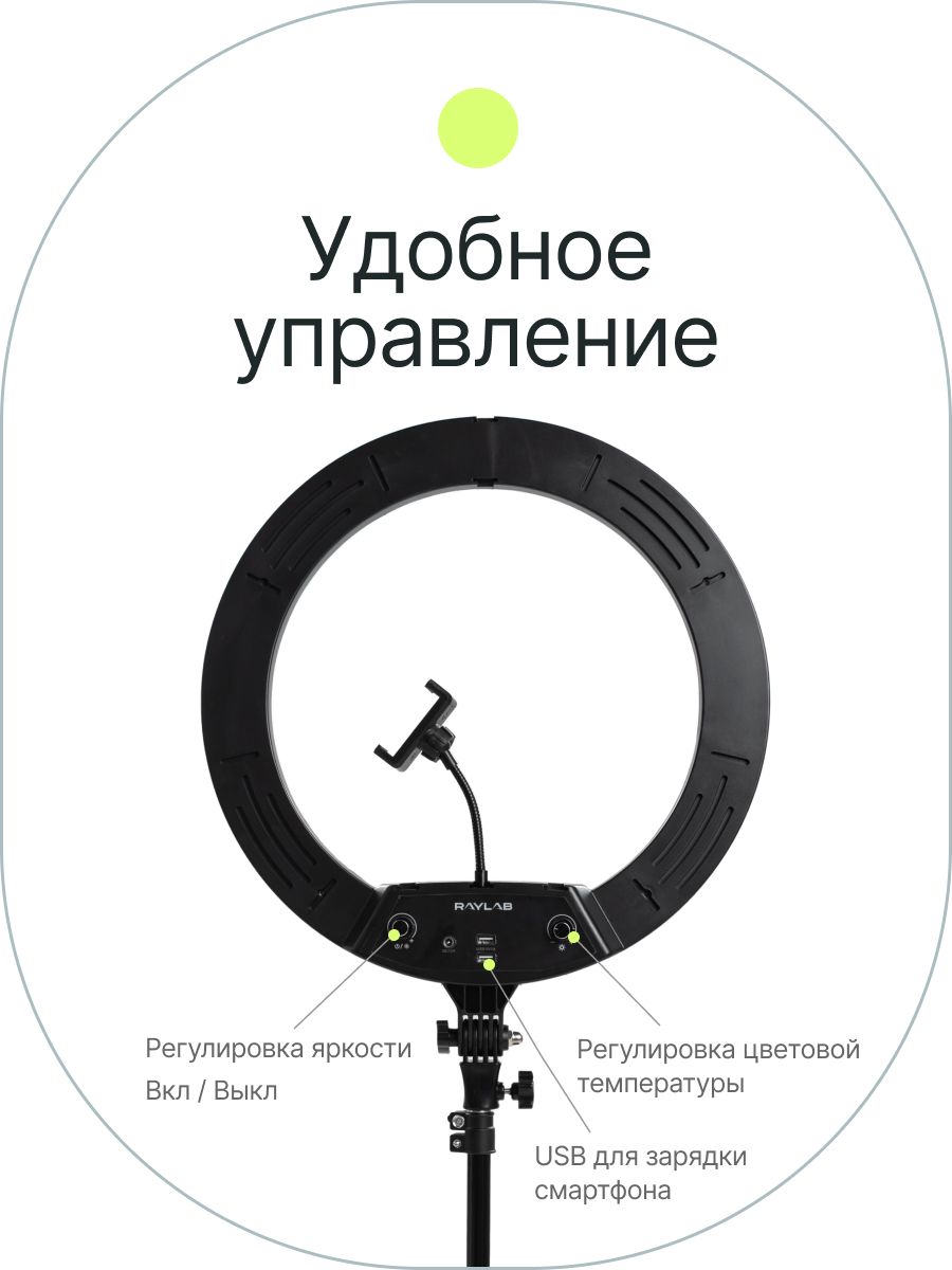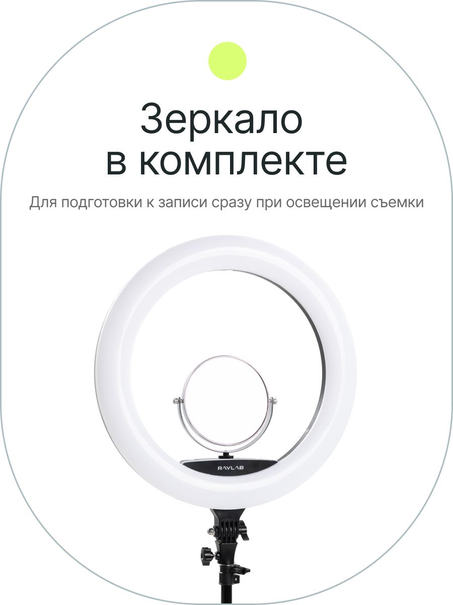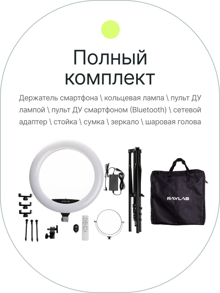 Описание: Светодиодный осветитель Raylab RL-0118 Kit кольцевой. Модель: RL-0118 Kit. Мощность лампы, Вт: 45-56. Световой поток, Лм: 3800. Цветовая температура, K: 2800-6500K. Тип лампы: LED. Количество ламп:400 диодов. Срок службы LED: 50 000 часов. Питание: DC12V, adaptor 12V. Материал корпуса: алюминий, пластик. Комплектация: держатель смартфона \ кольцевая лампа \ переходник с USB на розетку \ пульт ДУ лампой \ пульт ДУ смартфоном (Bluetooth) \ сетевой кабель \ стойка \ сумка \ шаровая голова \ зеркало. Кольцевая лампа Raylab - идеальный свет для фотосессии, бьютинга, нэйлинга или как домашний осветитель. Наш инновационный led свет - это незаменимое оборудование для фотографа, видеографа и контент-мейкера, данный фотосветильник обеспечивает яркое, мягкое и равномерное освещение сцены или объекта. Светодиодная лампа настольная легко переносится и устанавливается, что делает наши кольцевые осветители идеальным выбором для творчества в различных условиях. Независимо от вида съемки- предметная съемка, студийная съемка или дома, фуд съемка, портретная съемка или фэшн съемка, наш видеосвет предоставит Вам все необходимые средства для создания профессиональных и креативных работ. Хотите сделать профессиональные селфи или видеозапись на своем смартфоне? Наш штатив для телефона с лампой специально разработан для этой цели. Просто установите ваш телефон на удобный держатель и наслаждайтесь идеально выровненным и мягким видеосветом, который подчеркнет вашу красоту и улучшит качество видео. Штатив с лампой Raylab сделает коллаборации с блогерами и контент-криэйторами более профессиональными. Это надежное решение для создания контента в помещении или на открытом воздухе. Наше оборудование для видео Raylab также идеально подходит для создания видеосвета, обеспечивая качественное освещение для съемки видео контента на разных платформах. Этот светодиодный осветитель Raylab выведет ваши работы на новый уровень.