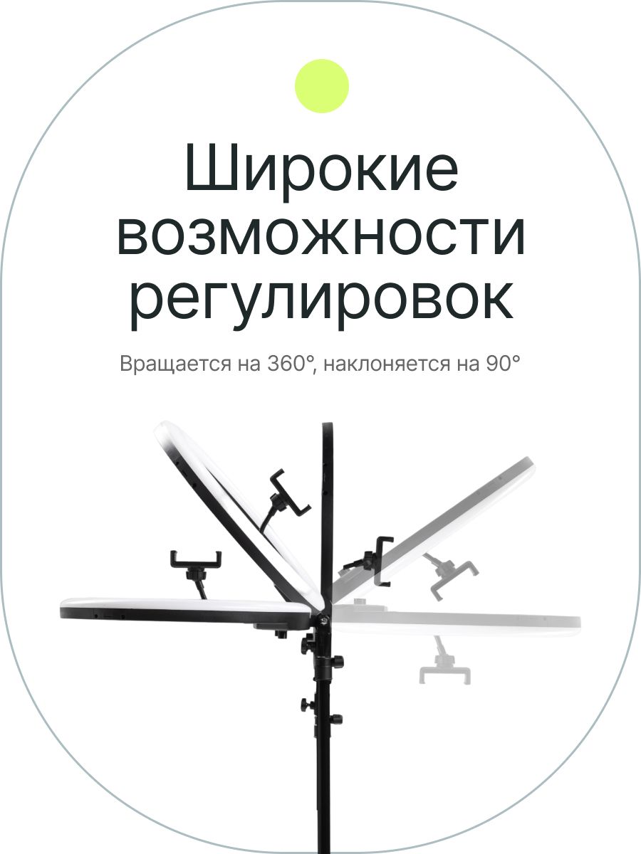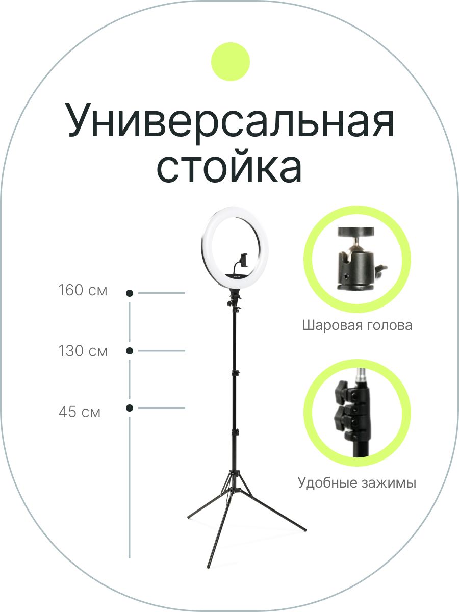 Кольцевая лампа, стойка, держатель смартфона -3 шт, пульт дистанционного управления лампой, пульт дистанционного управления смартфоном (Bluetooth), зеркало, сумка, переходник с USB на розетку, сетевой кабель, шаровая голова.