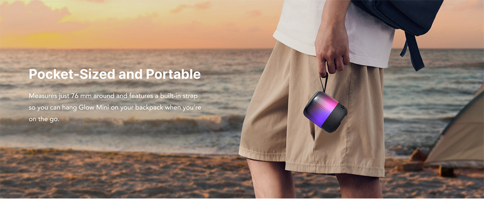 Карманный и портативный: имеет размер всего 76 мм вокруг и Встроенный ремешок, поэтому вы можете повесить Glow Mini на свой рюкзак, когда находитесь в дороге.