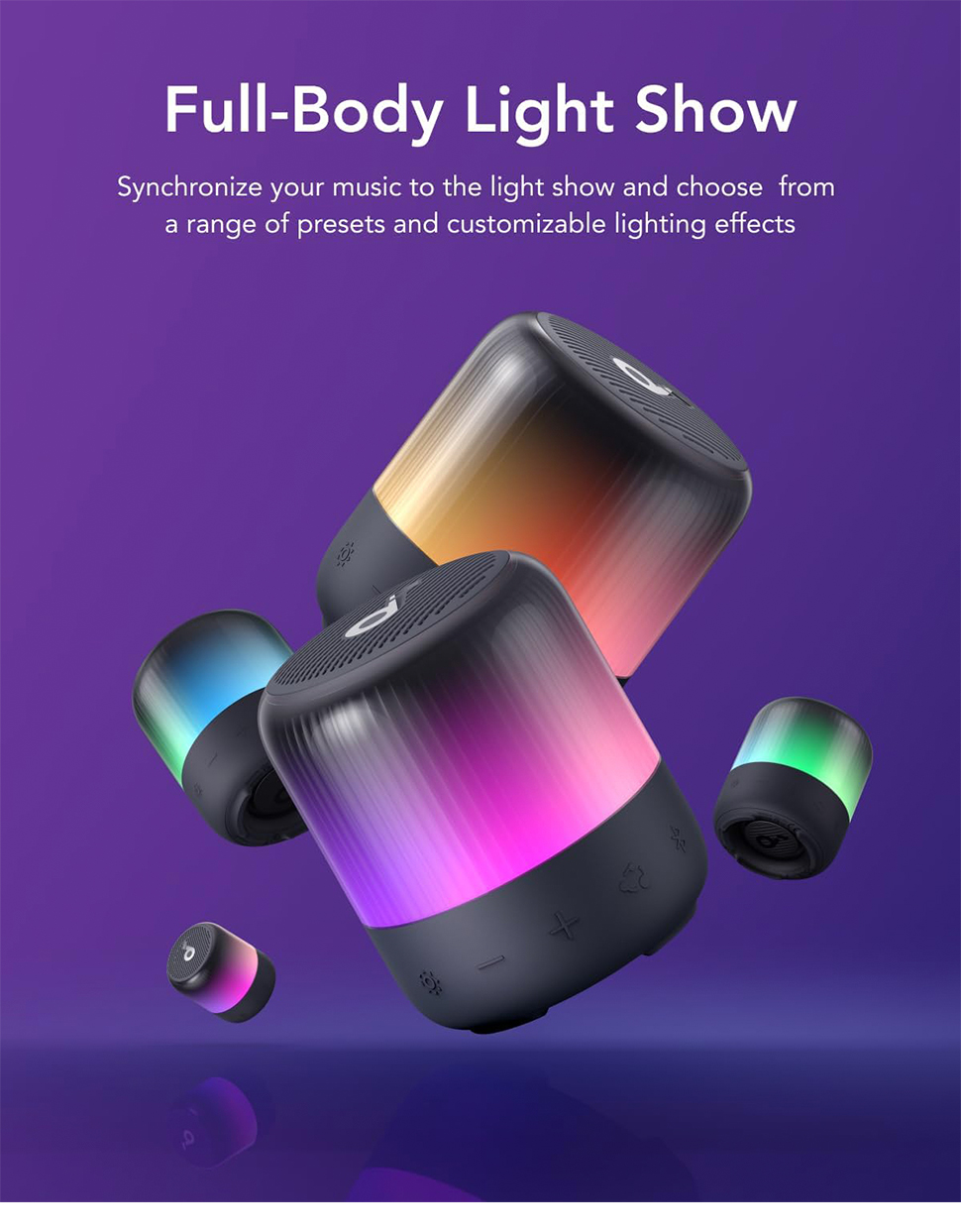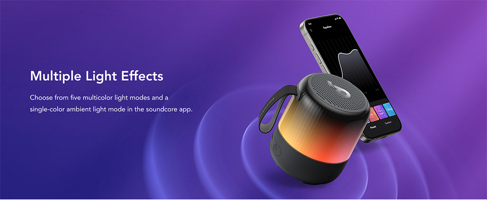 Настраиваемый эквалайзер и световые эффекты: Загрузите приложение soundcore и начните экспериментировать со световыми эффектами и эквалайзером, чтобы получить максимум от Glow Mini.