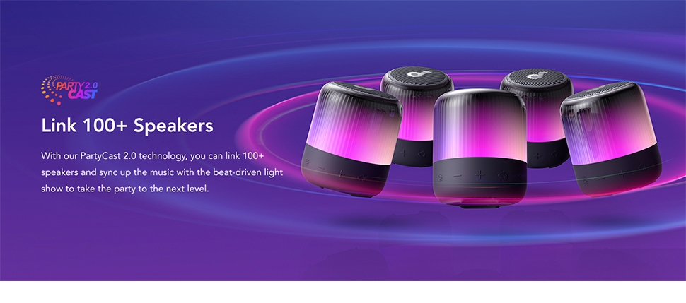 Связь 100 + динамиков: с помощью нашей технологии PartyCast 2,0 вы можете подключить 100 + динамиков и синхронизировать музыку с управляемым ритмом световым шоу, чтобы перейти на новый уровень.