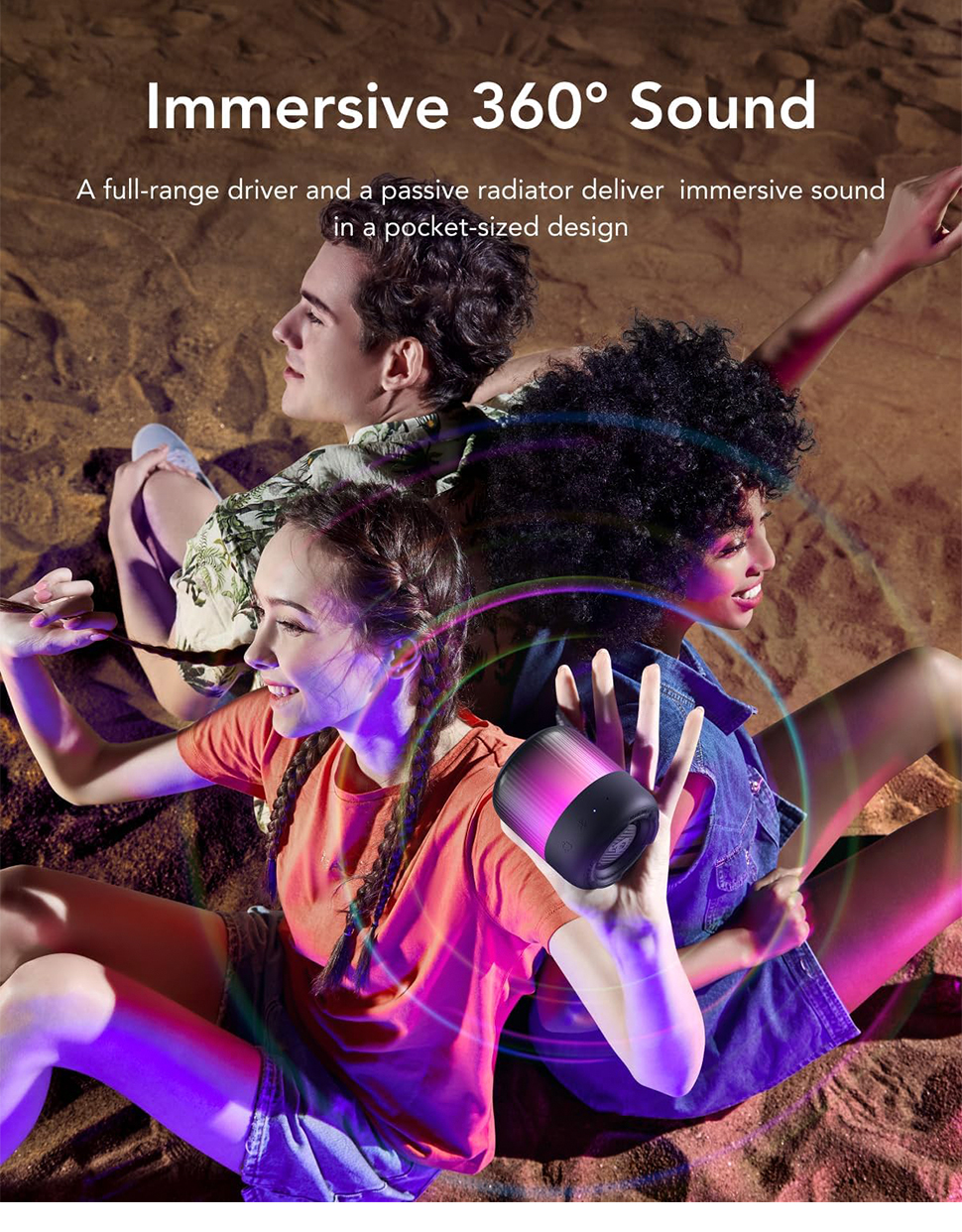 Встроенное световое шоу: освещение портативного динамика Glow Mini на 360 градусов синхронизируется со звуком, и имеет пять предустановок и Одноцветный режим окружающего освещения, чтобы перейти на новый уровень атмосферы вечеринки.