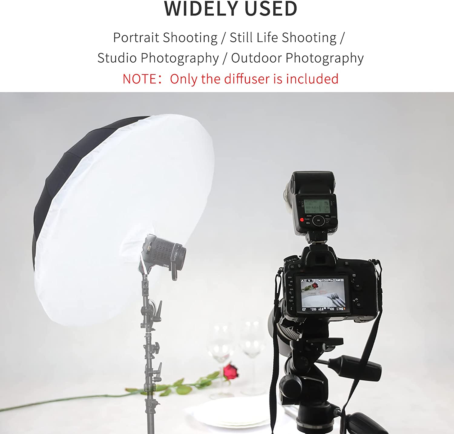 Параболический зонтичный диффузор от Meking-это полупрозрачный складной модификатор, который надеывается на параболический Зонт Selens и превращает его в большой софтбокс с небольшой потерей яркости, очень отлично подходит для портрета, люди и фотосъемка или сценарии, где вам нужен широкий, смягченный результат освещения.