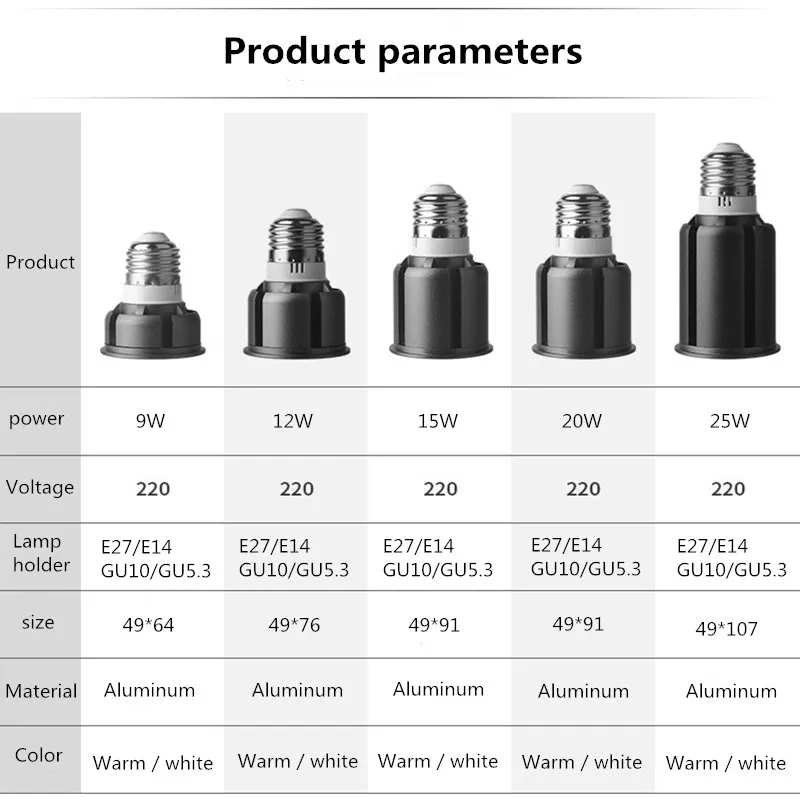 Тип цоколя: GU10 E27 E14 GU5.3 напряжение: 85-265 в (MR16-12 В постоянного тока) мощность чипа: 9 Вт 12 Вт 15 Вт 20 Вт 25 Вт чип: COB затемнения: доступные цвета: теплый белый (2700K-3500K) Холодный белый (5500K-6500K) угол луча: 60 градусов. (Очень широкий) Срок службы: 50000 часов. Сертификация: CE & ROHS & CCC