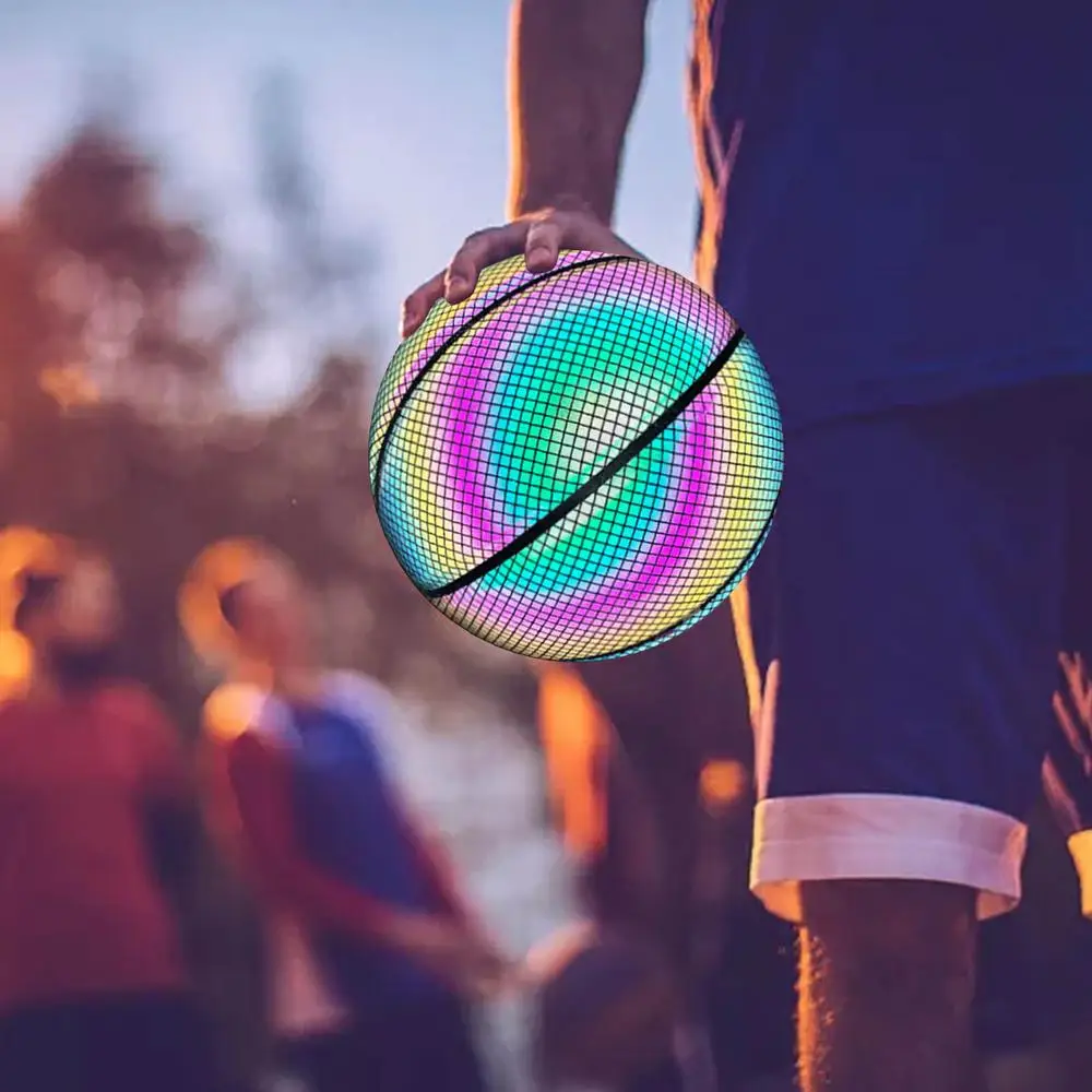 4. Применимость нескольких сценариев: Улучшите свою баскетбольную игру с помощью нашего светоотражающего мяча, независимо от того, Играете ли вы на полях, бетоне или крытых стадионах. Идеально подходит для ночных тренировок и использования в помещении/на открытом воздухе, его освещенные поверхности адаптируются к любым условиям освещения, что дает вам идеальный опыт баскетбола.