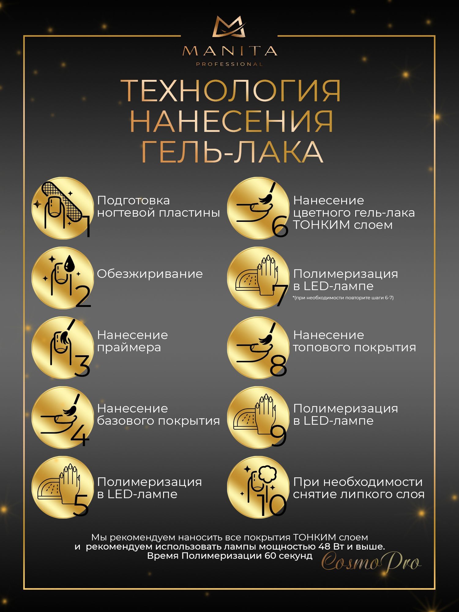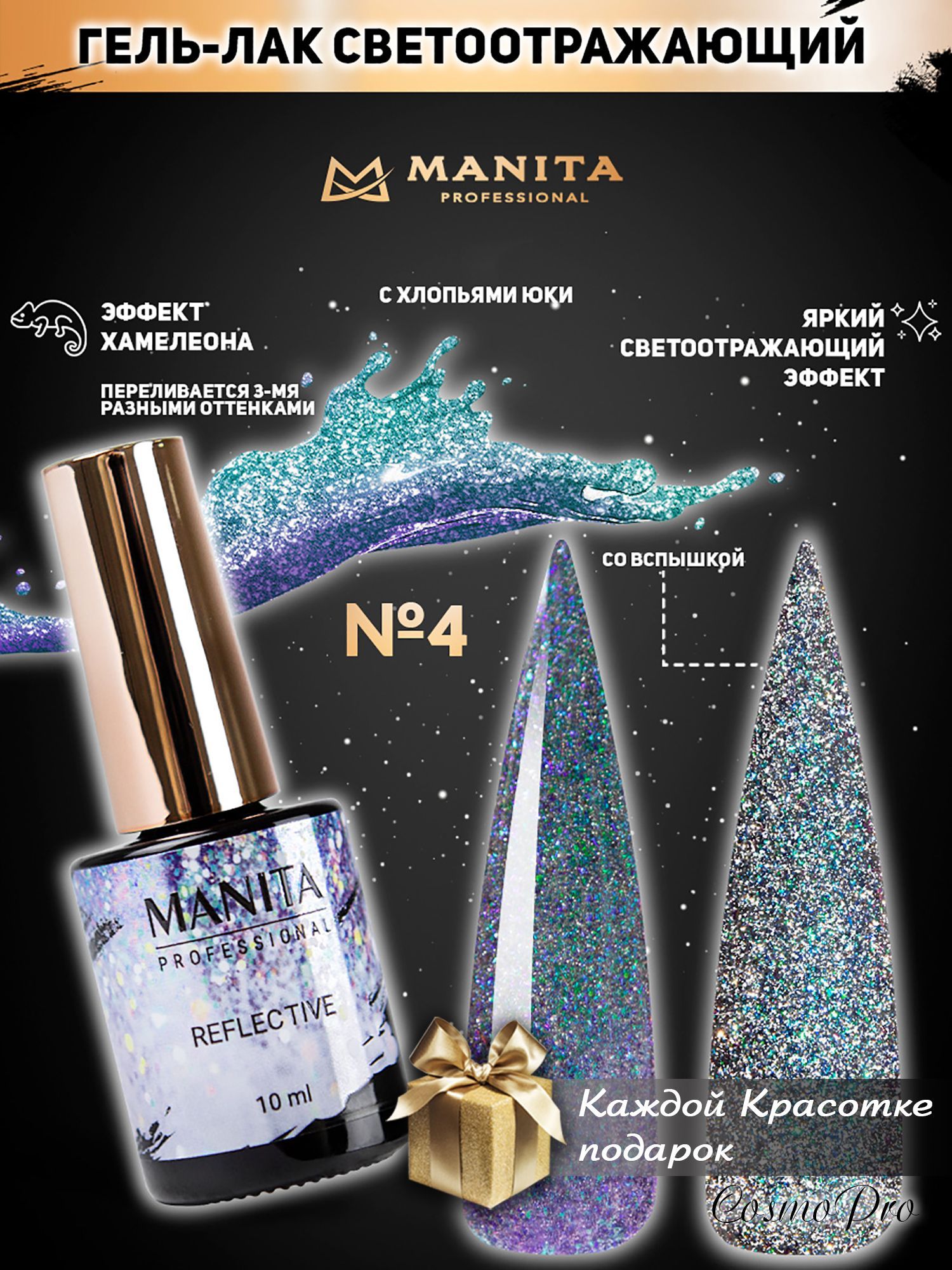 Описание: Профессиональная гипоаллергенная косметика для ногтей бренда MANITA PROFESSIONAL – это все для маникюра и педикюра высокого качества по приемлемой цене. Коллекция гель лаков MULTICHROME REFLECTIVE содержит хлопья юки, специальные светоотражающие блестки, которые мягко светятся при естественном освещении, как красивый плотный глиттер, а при искусственном свете вся эта прелесть похожа на Северное сияние - металлизированная мелкая пыль с ярко выраженным эффектом хамелеона, меняющая цвет в зависимости от угла наклона и освещения. У средства отличная плотность и насыщенный цвет, можно наносить его в один слой, но если хотите явного сияния, то потребуется два слоя. Не затекает за кутикулу, быстро сохнет, не полосит и не пузырится. Основные плюсы: качество превышает цену; гипоаллергенный; без неприятного запаха; легкое нанесение даже для начинающих nail мастеров; идеальная текстура; хорошая и удобная кисть; множество нетривиальных оттенков; не конфликтует с базой и топом других марок; стойкий, носится 4 недели; можно использовать для рисования на ногтях. Для просушки и полимеризации используется лампа для маникюра UV / LED. Не высыхают на «открытом» воздухе. ВАЖНО! Каждый цвет очень пигментированный (плотный), и его НУЖНО НАНОСИТЬ МАКСИМАЛЬНО ТОНКИМ СЛОЕМ (как первый, так и последующие) и каждый слой обязательно просушить. Светоотражающий топ в стиле кошачий глаз и поталь - это тренд! Цветные оттенки Мультихром Рефлектив отлично смотрятся в мононансении, а также при добавлении на кончики. Комбинируйте, экспериментируйте, соберите свой набор гель лаков для ногтей для любого повода и без: на каждый день, новый год, день рождение! И вы однозначно влюбитесь во всю МАНИТА ПРОФЕССИОНАЛ!