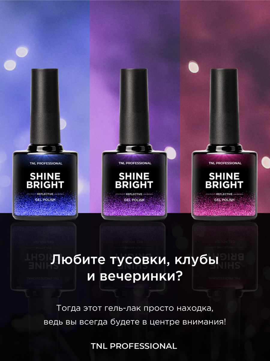 Описание: Коллекция гель-лаков для ногтей TNL Shine Bright - это 12 удивительных цветов со светоотражающими частицами.