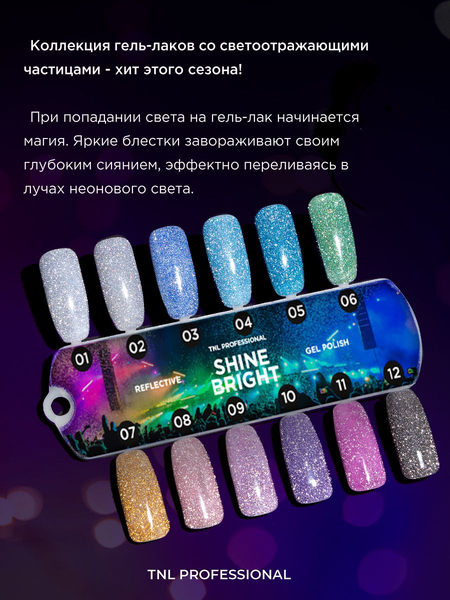 Описание: О товареShine Bright — это коллекция гель-лаков со светоотражающим эффектом для создания оригинального маникюра. Глубокое сияние частиц раскрывается при попадании на них искусственного освещения: они отражают лучи света и придают ногтям ослепительный блеск, завораживая ярким шиммером. Средства имеют среднюю консистенцию и идеальную укрывистость. Продукт легко наносится, самовыравнивается и не затекает на кутикулу.Гель-лаки TNL представляют богатый выбор оттенков на любой вкус. Профессионалы и начинающие мастера оценят комфорт и удобство в работе: средства легко наносятся и не вызывают трудностей при снятии. Обладают повышенной устойчивостью к внешнему воздействию и могут держаться в течение 3-4 недель.Способ применения:Подготовьте ногти: снимите глянец мягким бафом, обезжирьте, нанесите праймер.