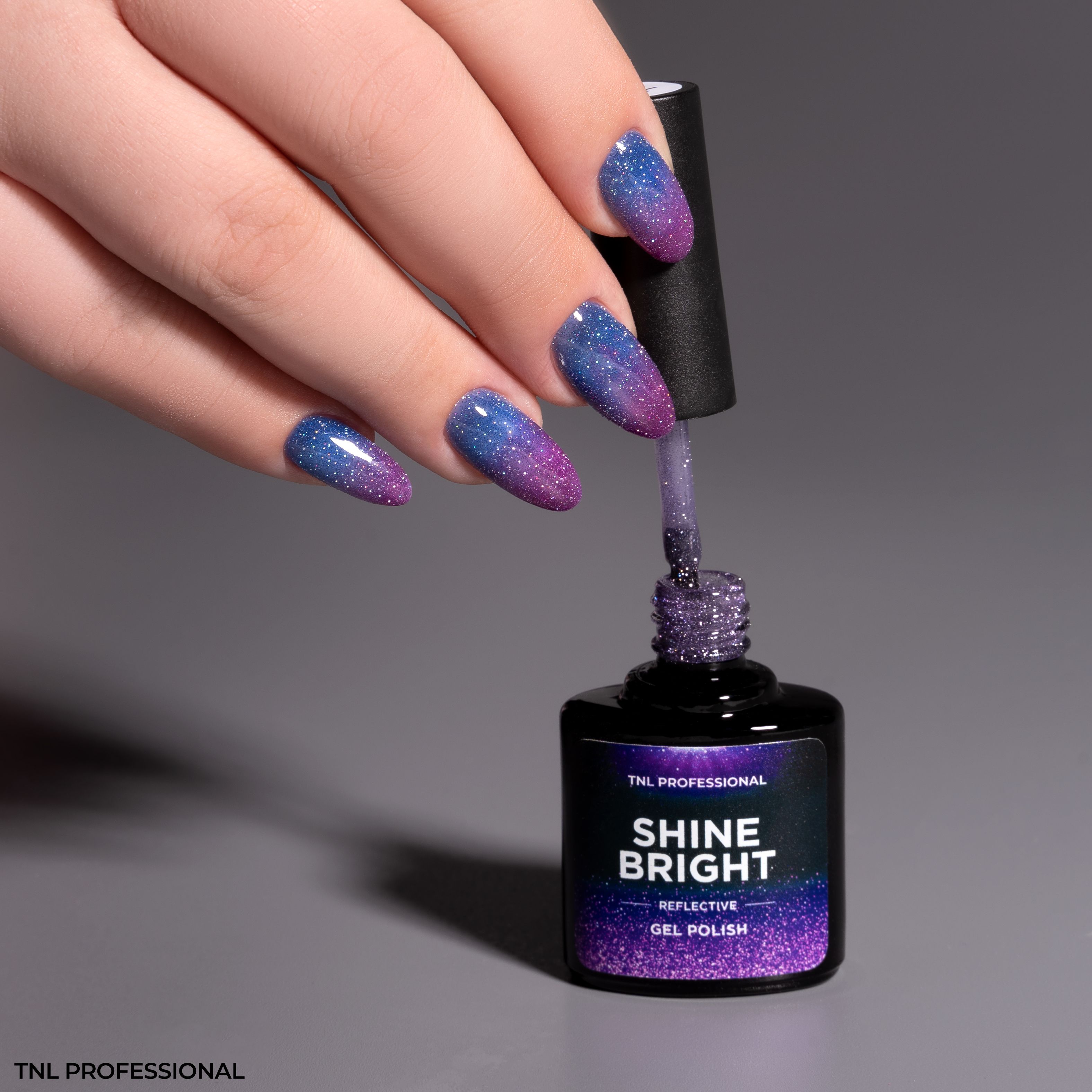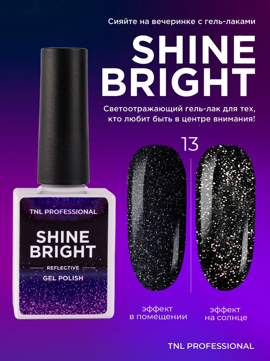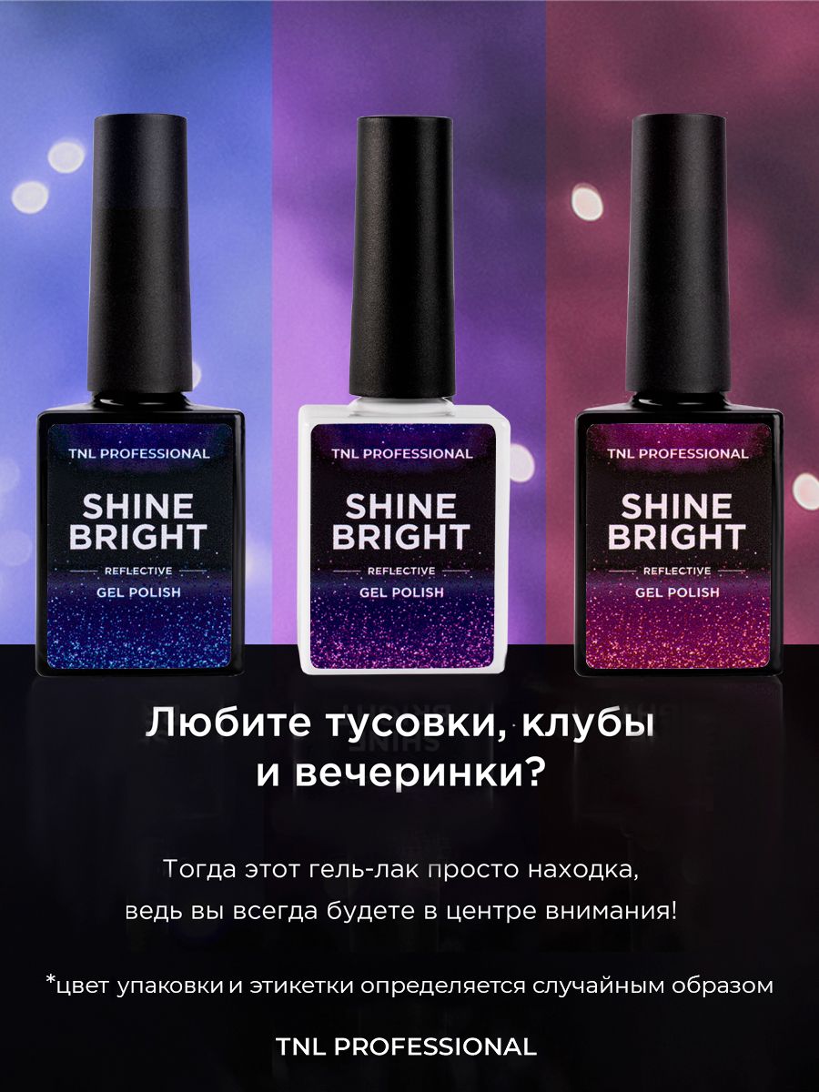 Описание: Коллекция гель-лаков для ногтей TNL Shine Bright - это 12 удивительных цветов со светоотражающими частицами.
