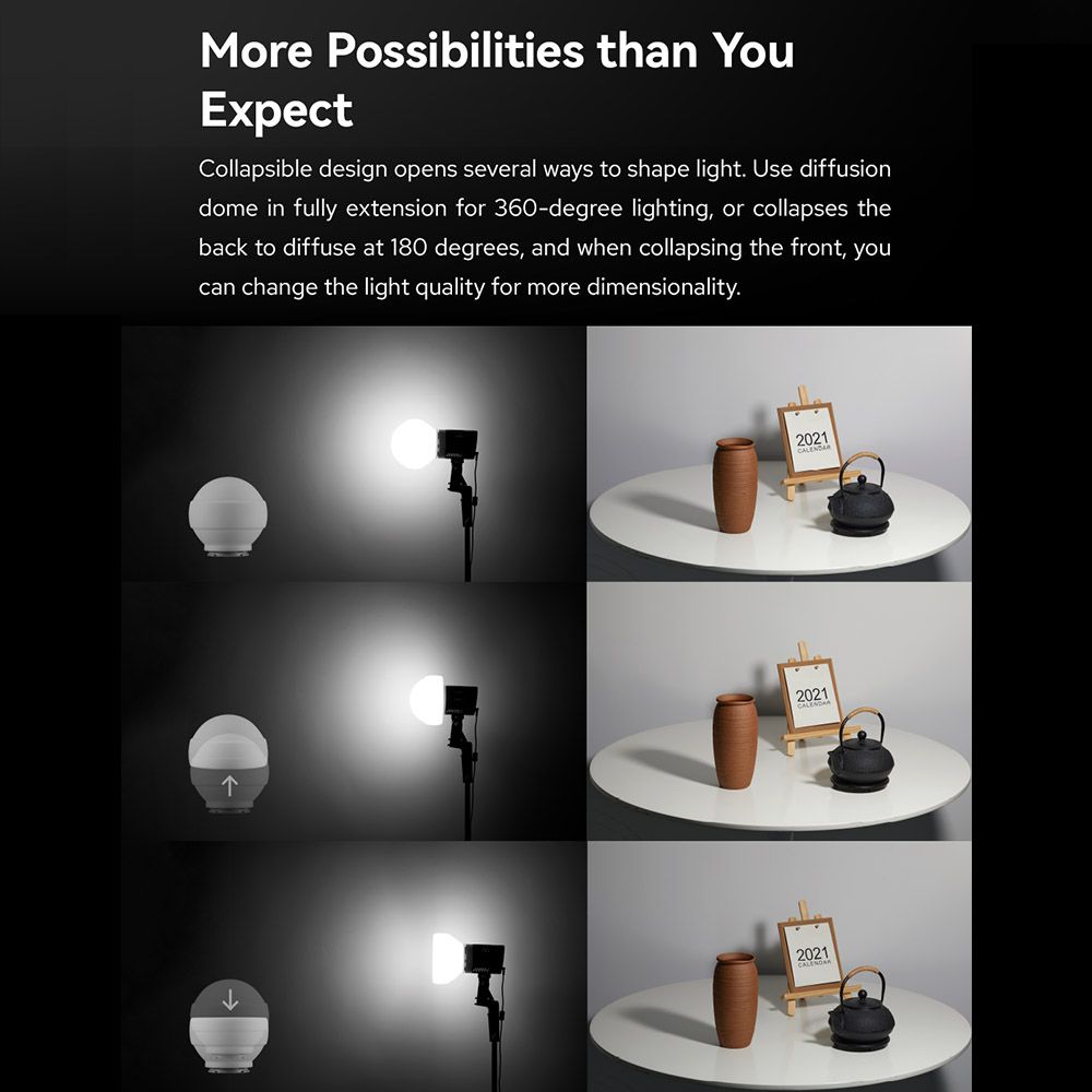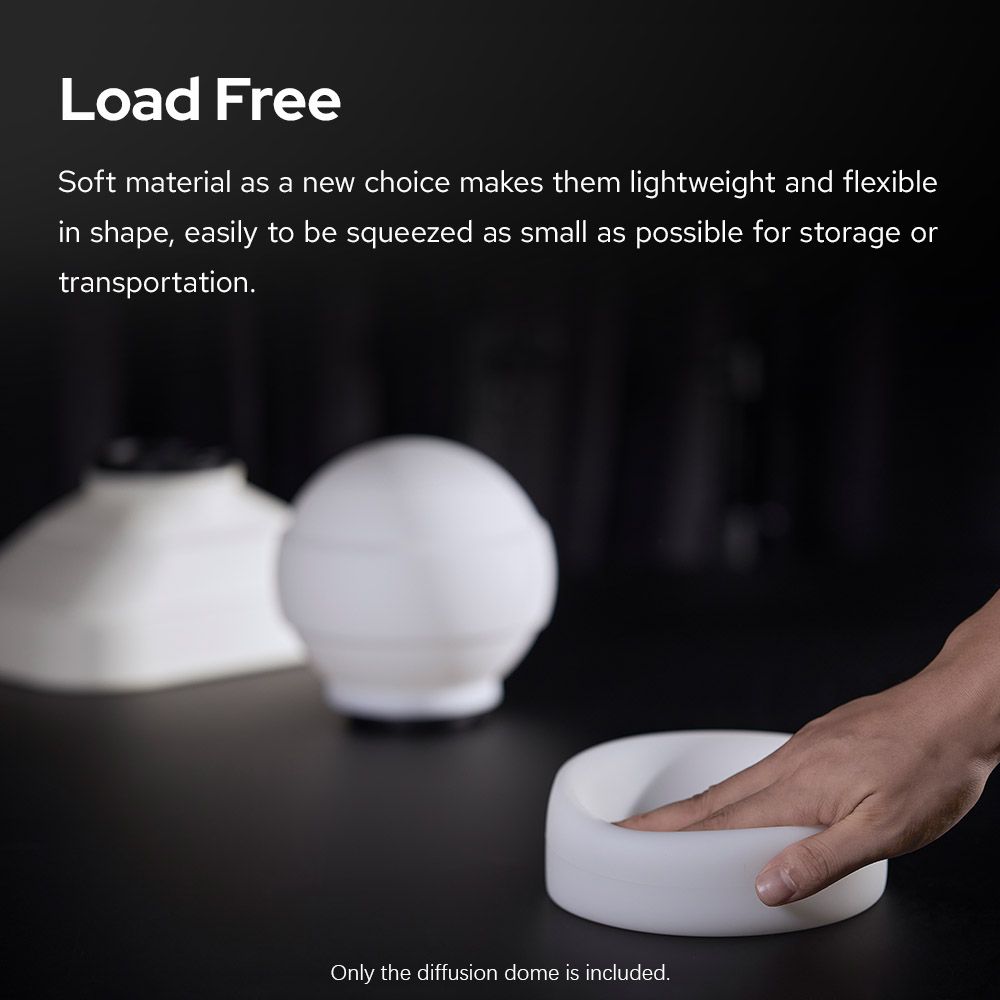 Складывающаяся конструкция, обеспечивающая несколько способов формирования света, круглый купол обеспечивает освещение на 360 °, а задняя часть складывается для рассеивания на 180 °.