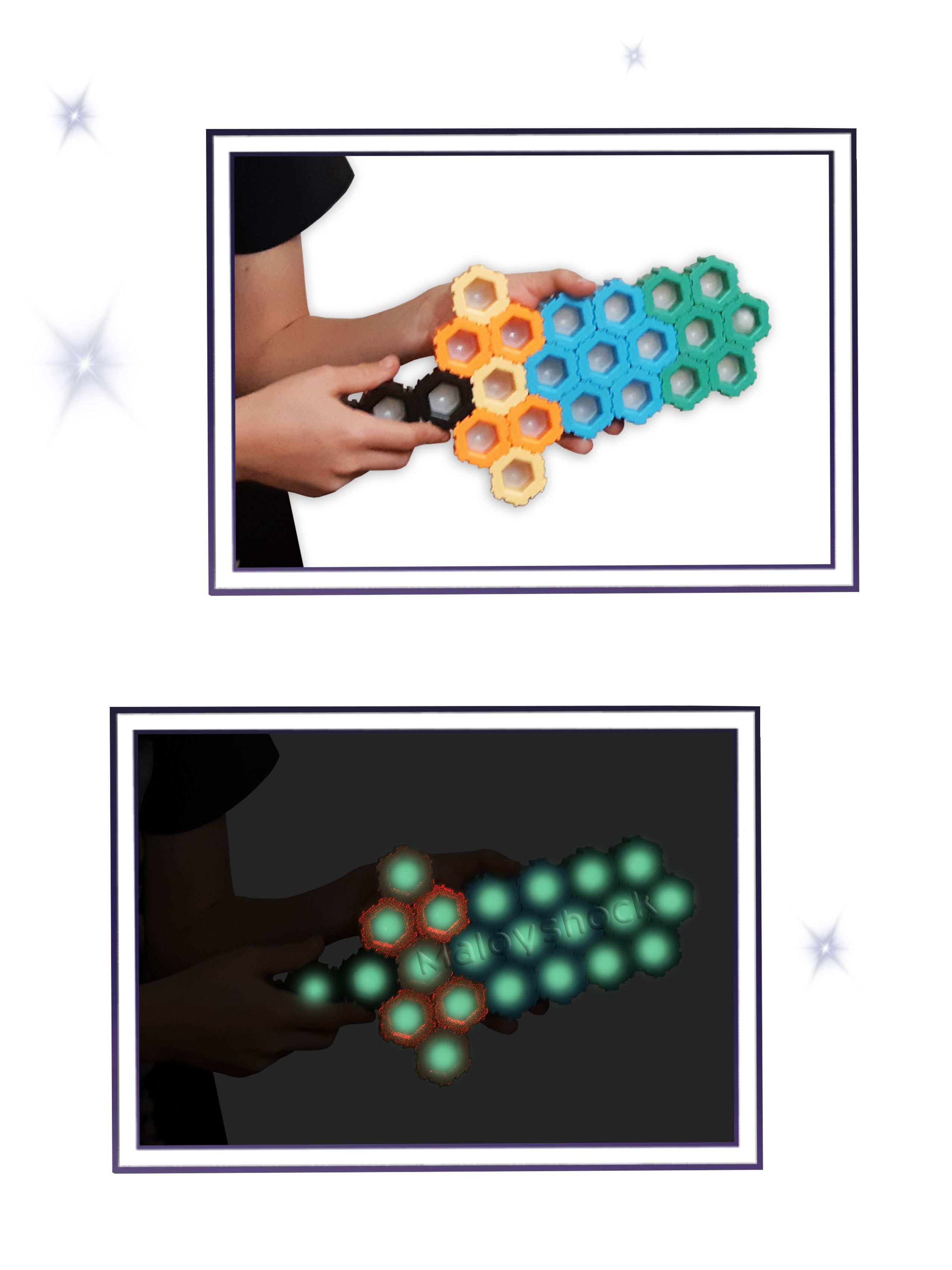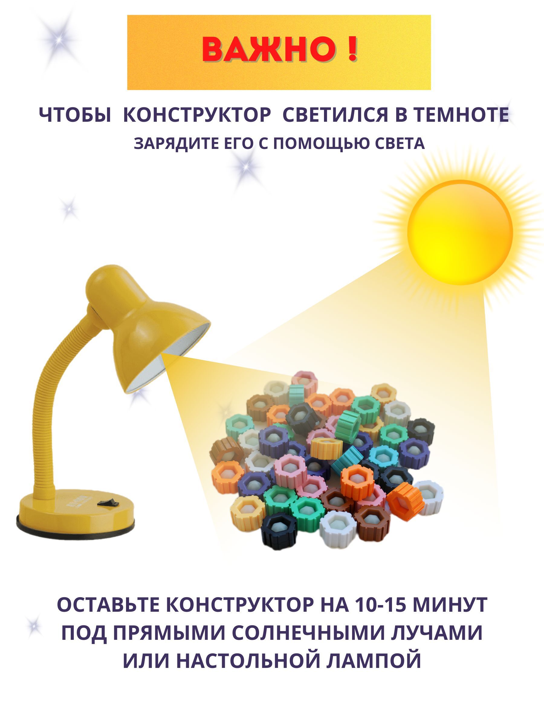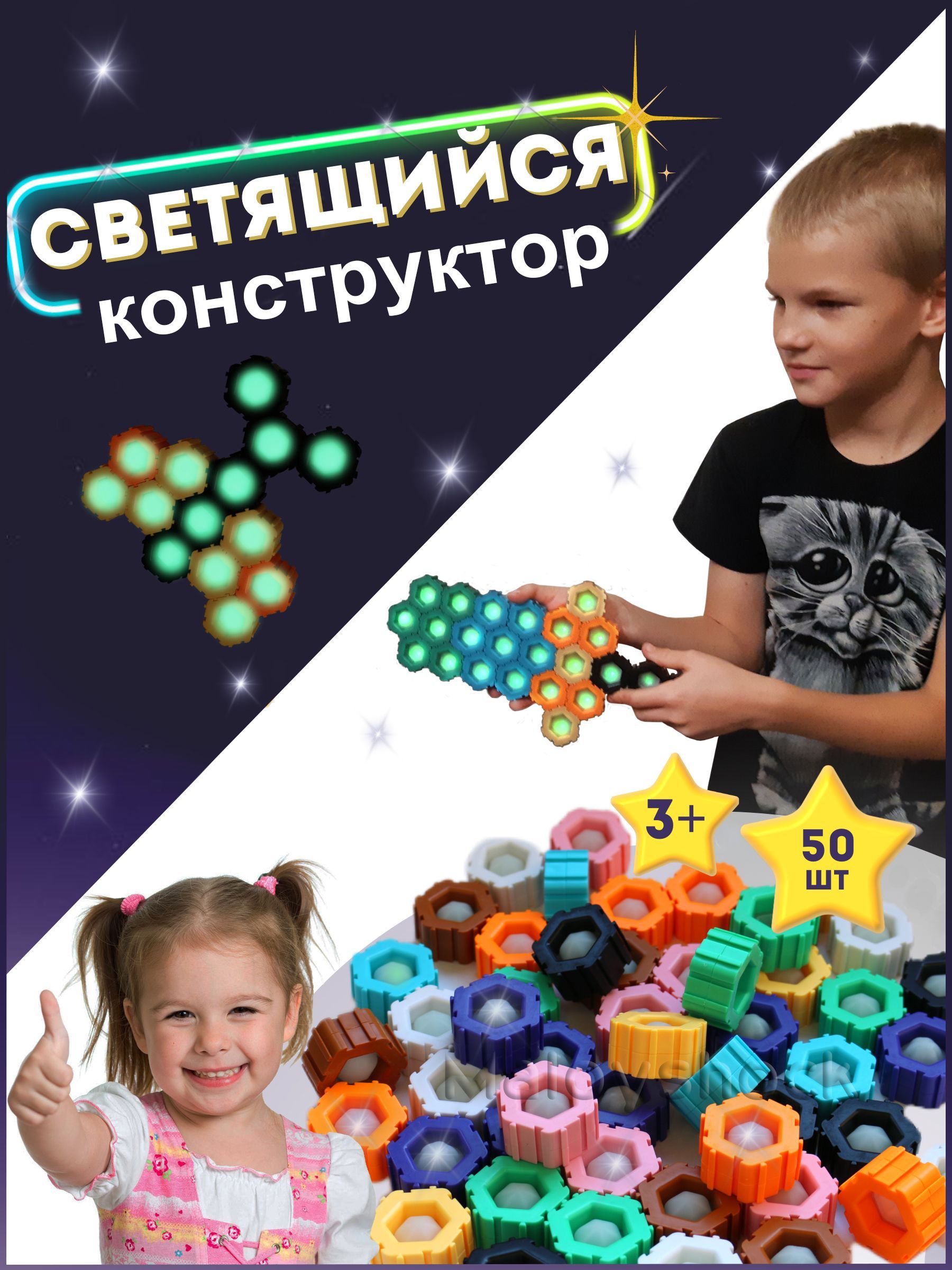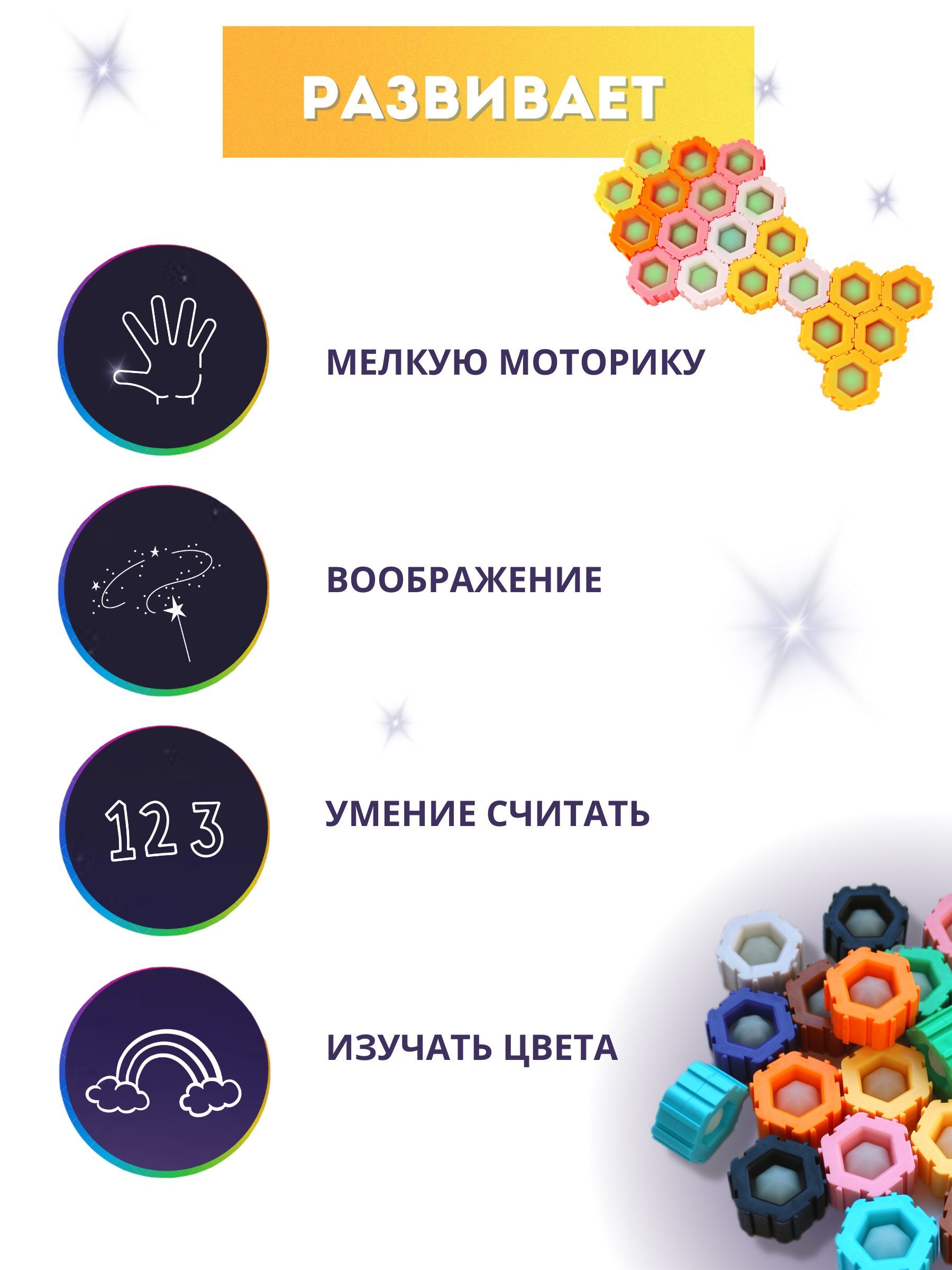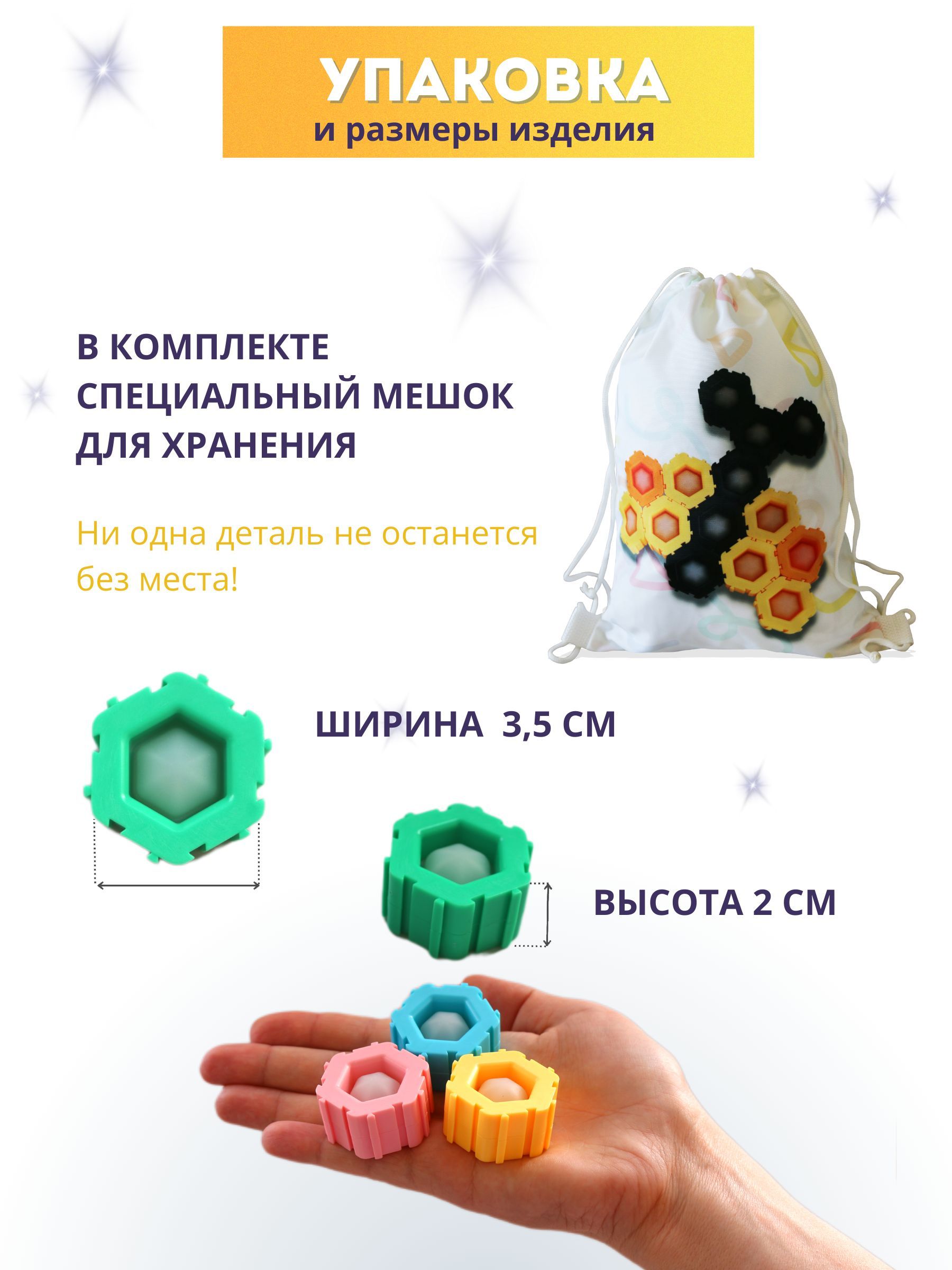Описание: Наш детский развивающий конструктор мозаика - отличный игровой набор для мальчиков и девочек! В нем имеется 50 штук устойчивых шестисторонних блоков с уникальной опцией - серединка каждой детали светится в темноте! Чтобы активировать свечение, достаточно зарядить игрушку для малышей солнечным светом или использовать настольную лампу. Нажав на деталь, она становится выпуклой то в одну, то в другую сторону, что делает развивашку интересной и увлекательной. Этот крупный блочный конструктор будет отличным инструментом развития для детей, он увлечет их безграничными возможностями конструирования и моделирования и станет незаменимым в качестве игр на логику. Дети смогут собирать игрушечные пластиковые конструкции в разные фигуры, тренируя свою фантазию, художественный вкус, мелкую моторику и логическое мышление. Он также поможет тренировать необходимые психомоторные функции, развивать навыки пространственного ориентирования и укреплять усидчивость. Наш светящийся канструктор идеален в роли подарка для детишек от 3 лет на день рождения, новый год или просто как приятное увлечение. Игры с ним позволят прокачивать свою творческую и креативную сторону, моделировать и создавать собственные потрясающие фигуры. Он поставляется в мешочке, который облегчает его хранение и организацию. Не упустите шанс предложить своему ребенку увлекательные интеллектуальные задачи и веселое времяпрепровождение с нашим комплектом!