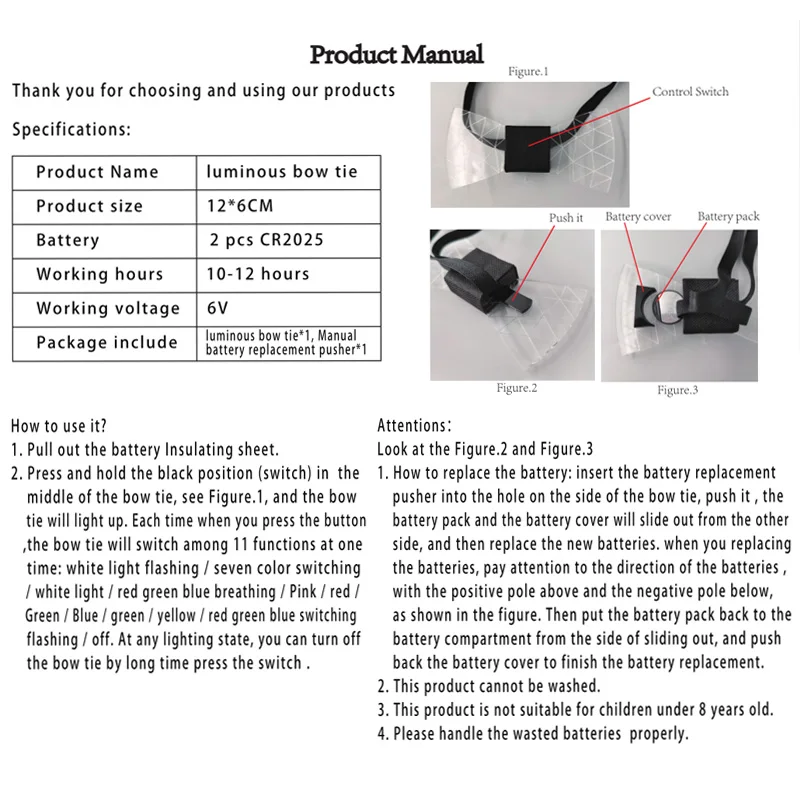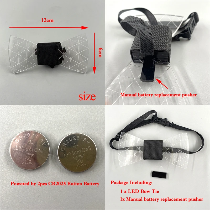Питание от: 2 батарейки-кнопки CR 2025 для галстука-бабочки многоцветного типа (в комплекте),2 батарейки AA для галстука-бабочки одного цвета (не входят в комплект)