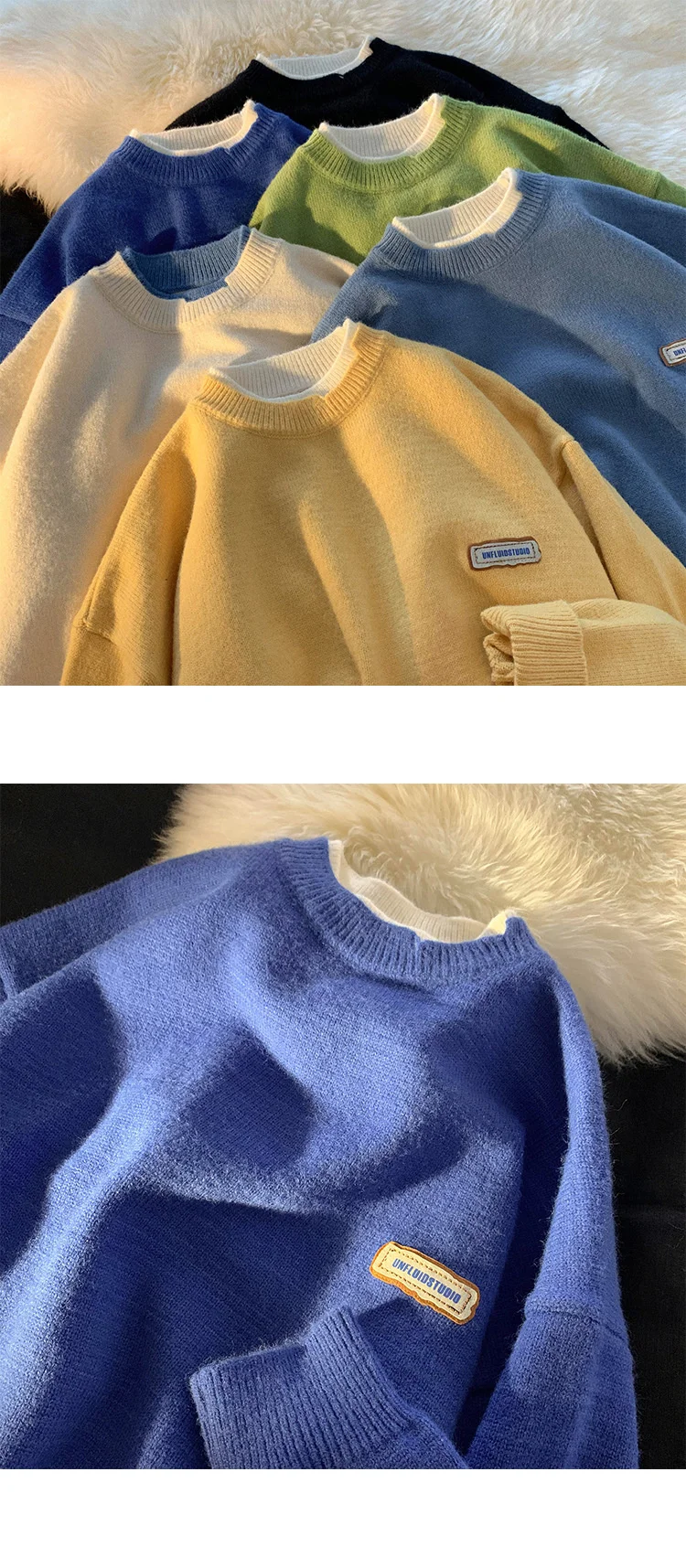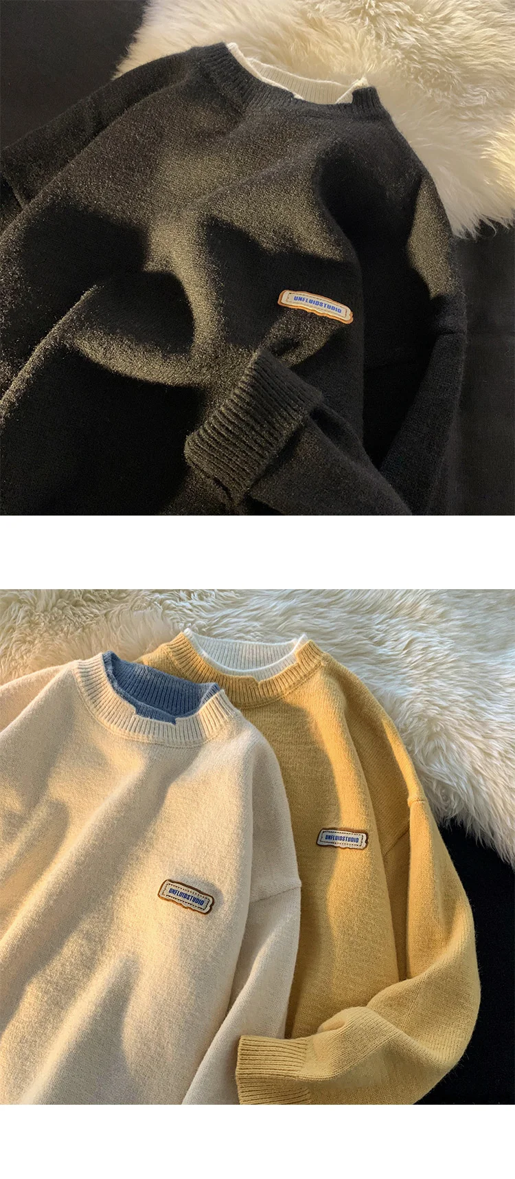 Свитер мужской из двух частей в стиле Харадзюку, мягкий Однотонный пуловер с круглым вырезом, Модный трикотажный свитер с длинным рукавом, весна-осень