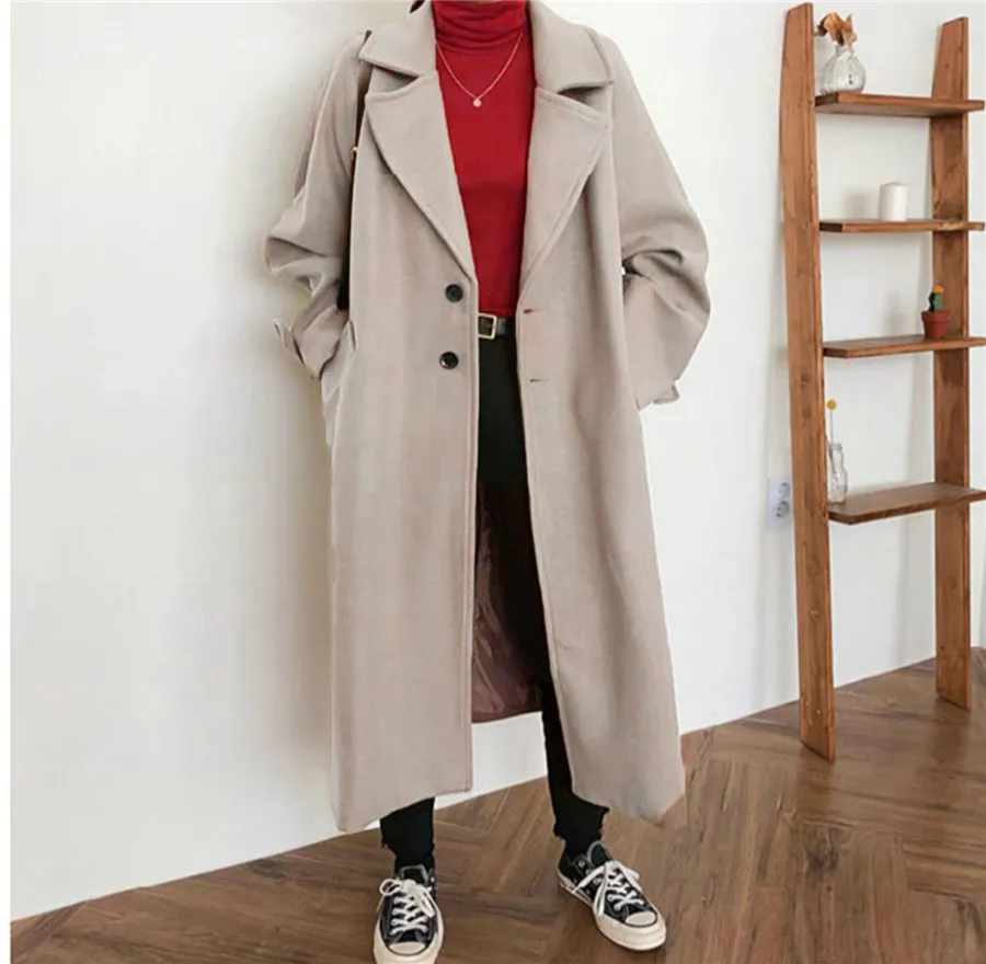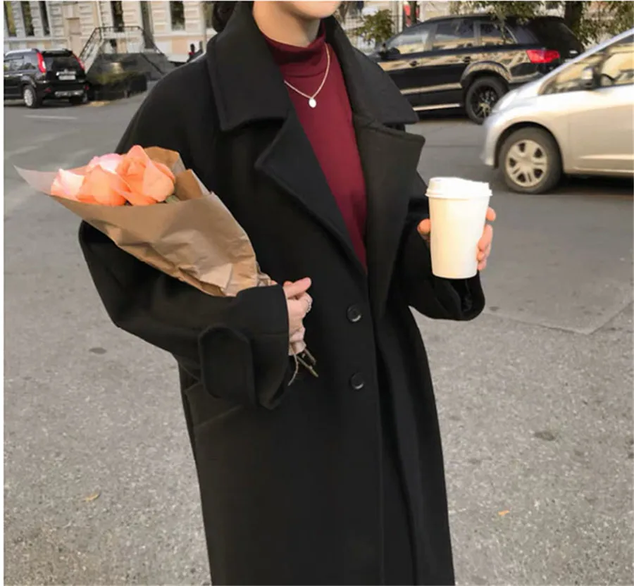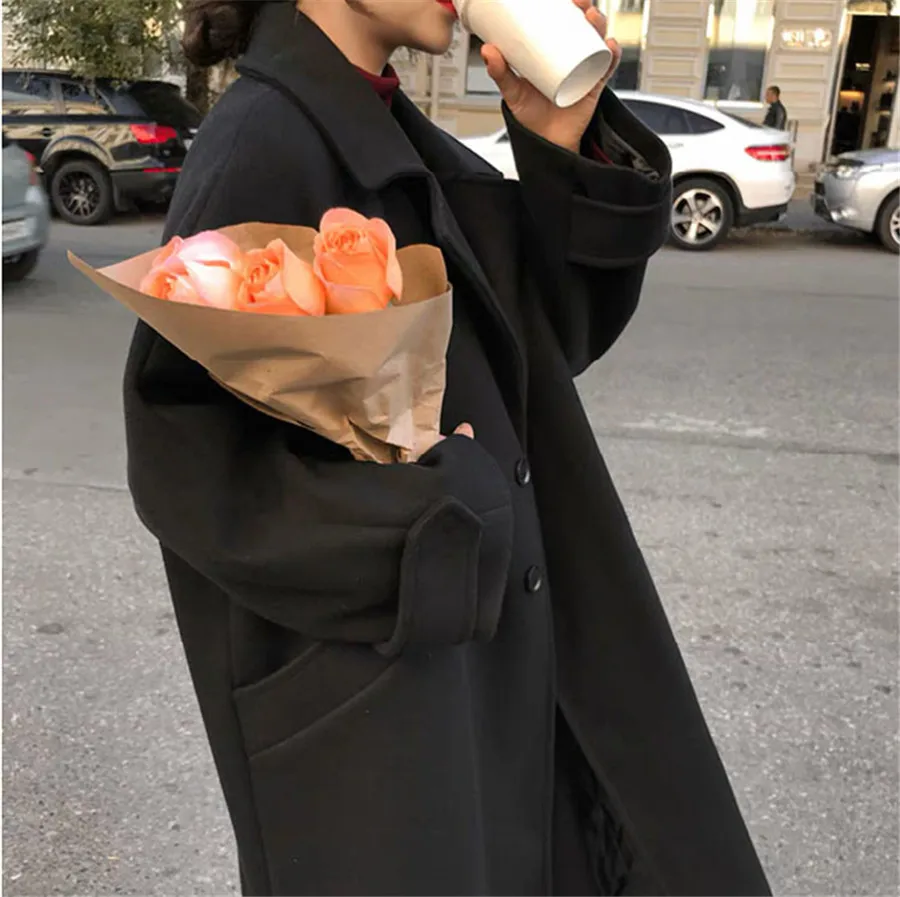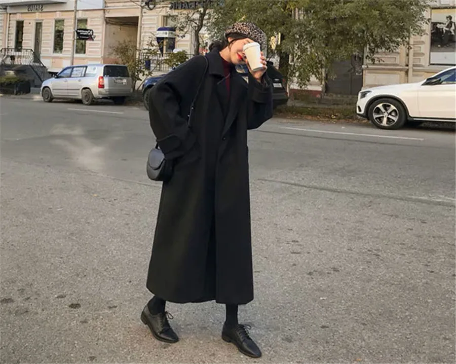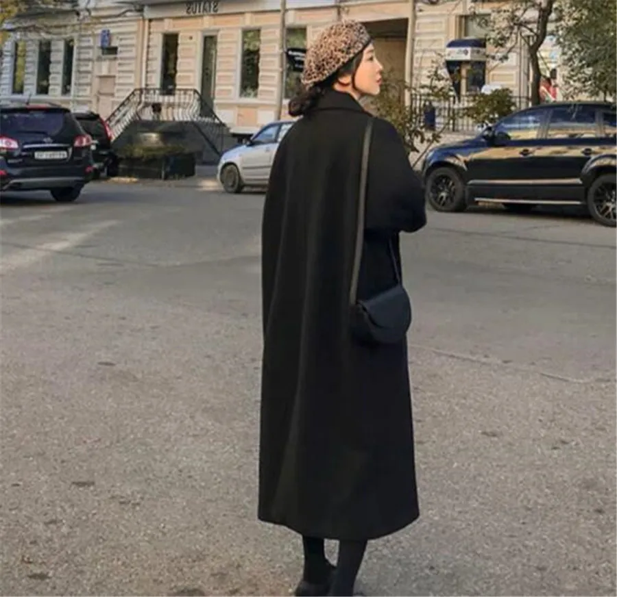 Свободное черное шерстяное пальто, женское осенне-зимнее модное длинное пальто, Корейская элегантная приталенная фея, весенние женские пальто для студенток OK801