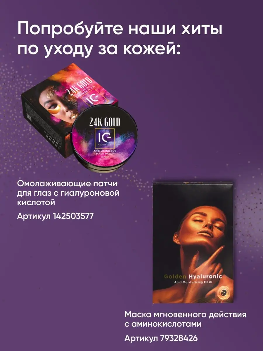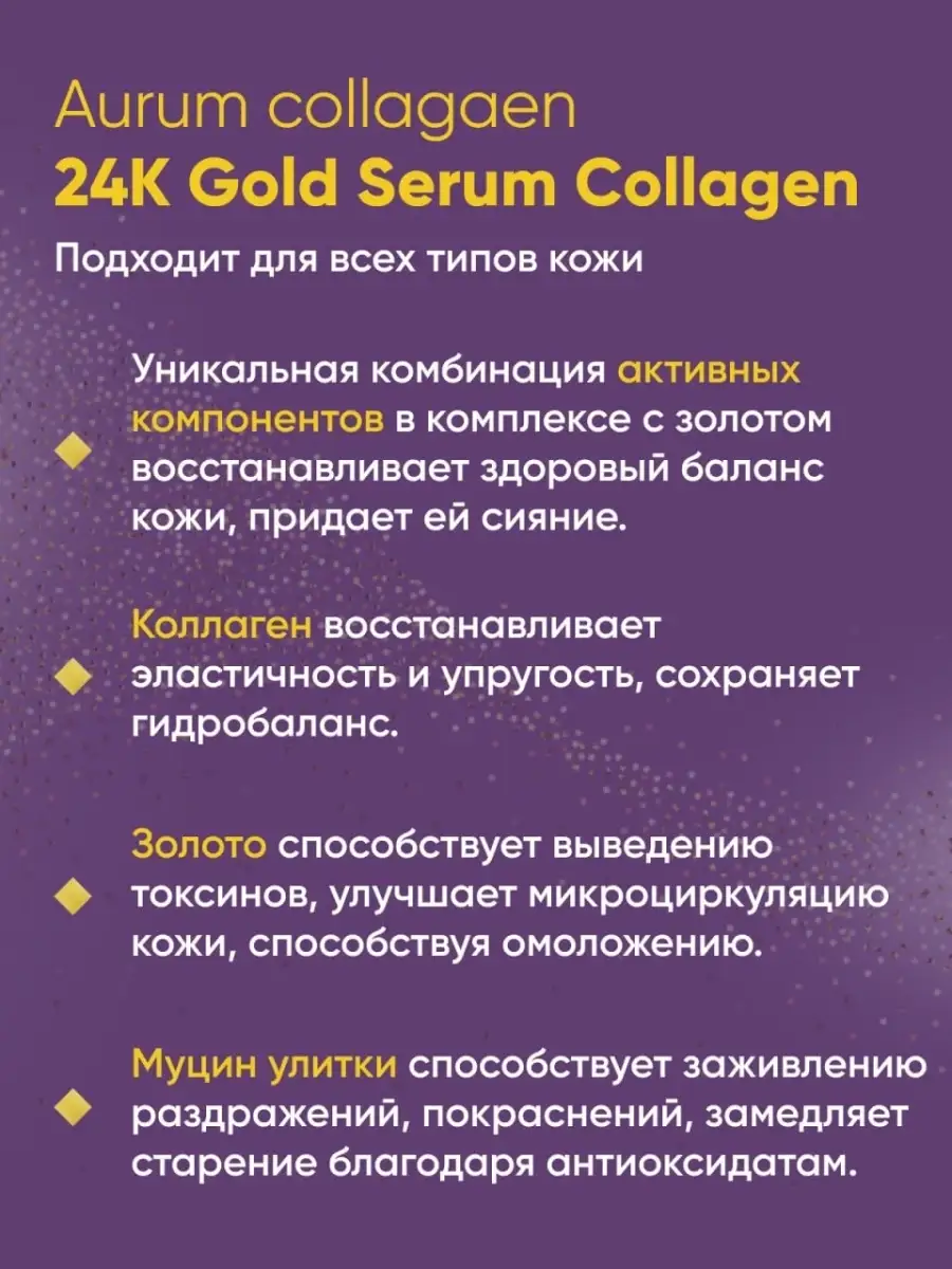 Артикул 79474843 Состав Вода, Глицерин, Сополимер PVM/MA, Золото, Бетаин коллагена, Трегалоза Глицерин, Гиалуронат Натрия; Таурин, Бетаин, Серин, Фильтрат Секрета улитки, Бутиленгликоль, Ацетилгексапептид-8; Ацетилтетрапептид-5, Олигопептид-1, Листья Алоэ Барбаденсис Экстракт, Экстракт Морских водорослей