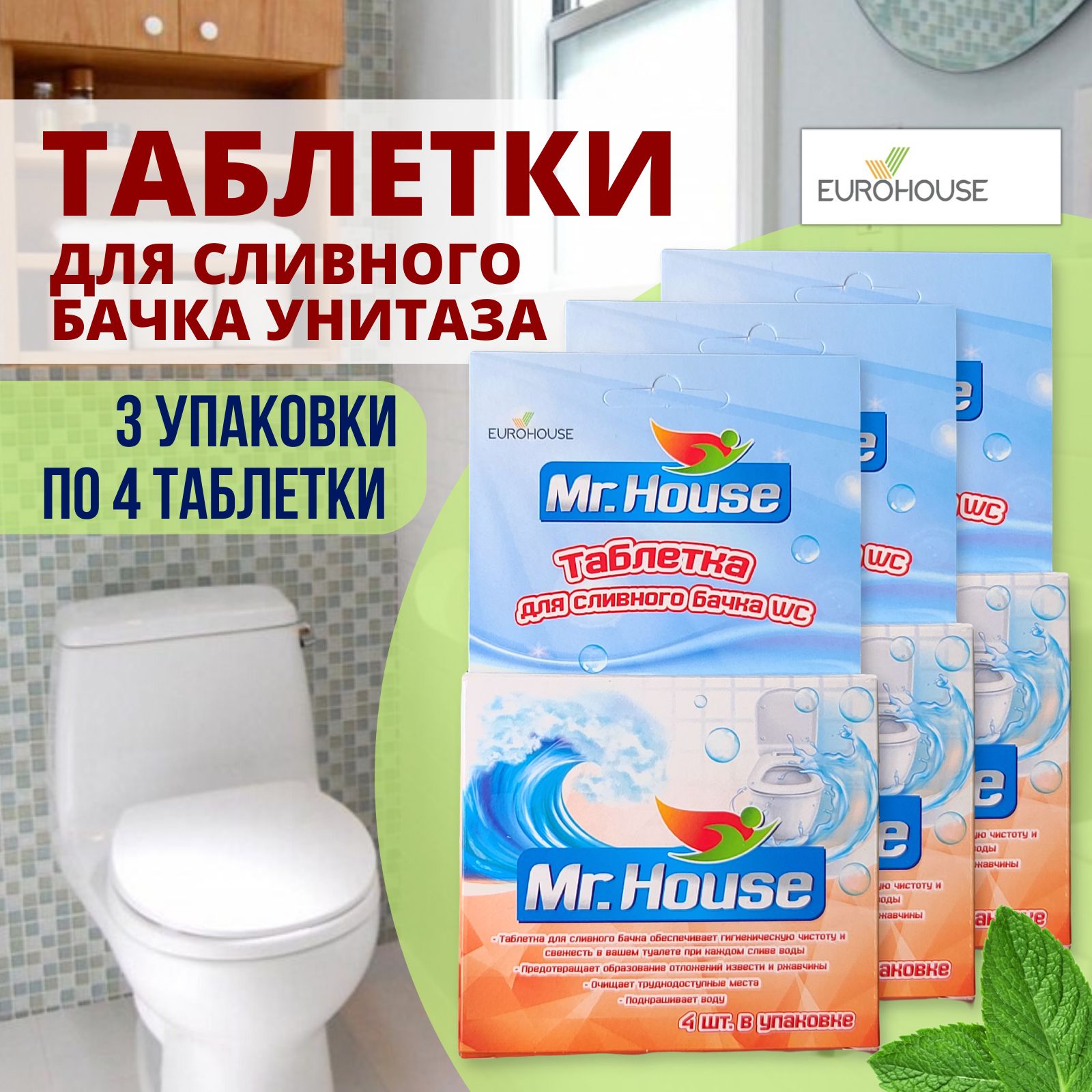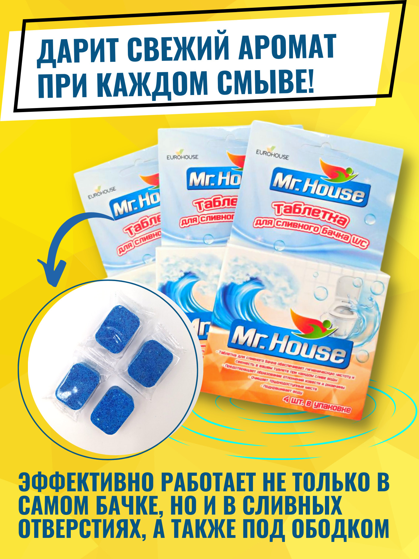 • Активная очистительная таблетка Mr.House для сливного бачка окрашивает воду в синий цвет.