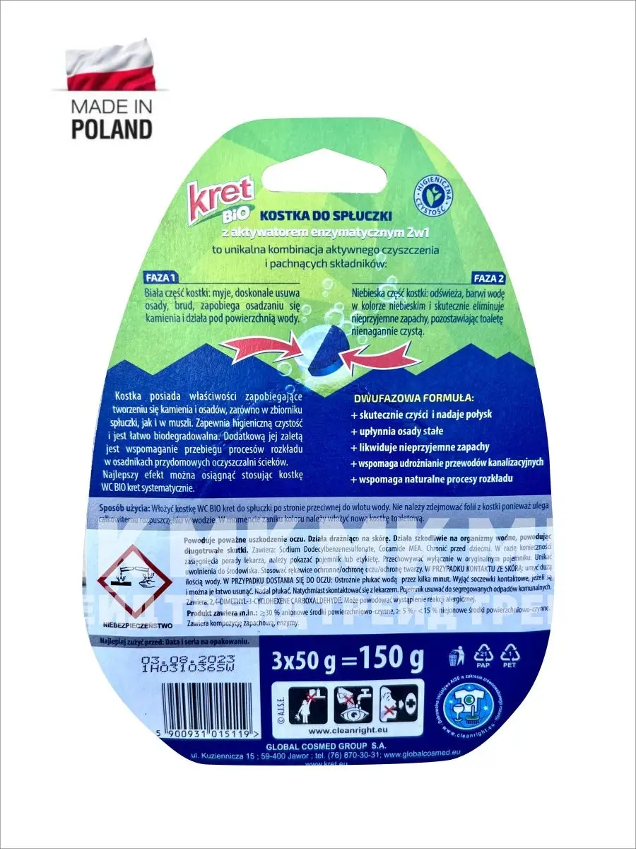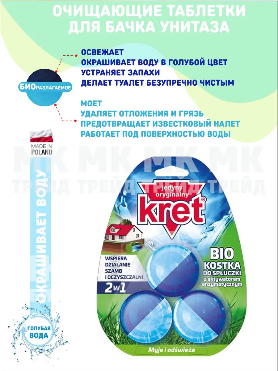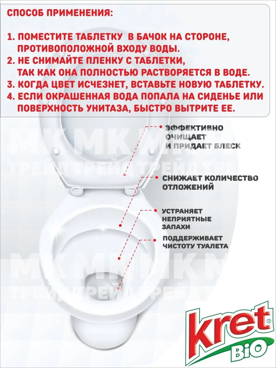 Описание: Чистящее средство для туалета в виде таблеток для бачка представляет собой инновационное сочетание активных ингредиентов - очищающих средств и ароматизаторов. Удаляет мочевой (уриновый) камень, ржавчину, известковые отложения, жировые и другие загрязнения. Дезинфицирует и освежает обработанную поверхность. Обеспечивает сияющий блеск и гигиеническую чистоту.Фаза 1 - очищает, отлично удаляет осадок, грязь, предотвращает образование накипи и работает под поверхностью воды. Фаза 2 - синяя часть таблетки: освежает, окрашивает воду, придает ей синий цвет. Способ применения: Снять крышку бачка унитаза и таблетку в плёнке поместить в противоположной от потока вливающейся в бачок воды стороне. Плёнка быстро растворяется. Препарат действует пока вода окрашена. Хватает более чем на 400 смывов. Гигиеническая свежесть и чистота каждый день