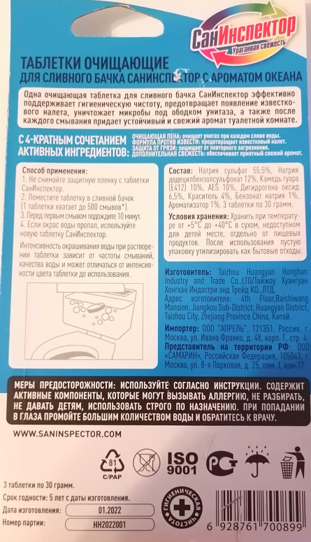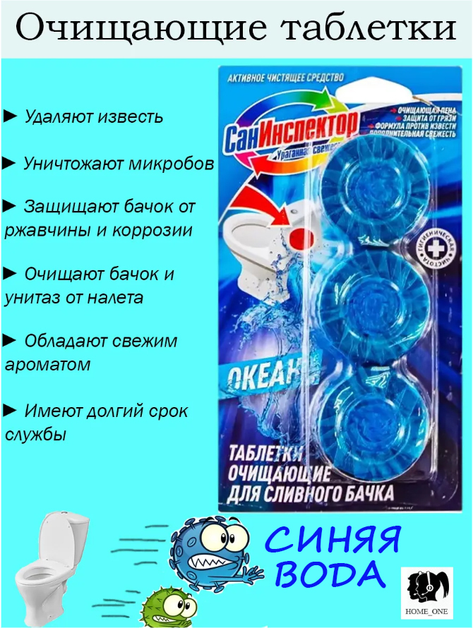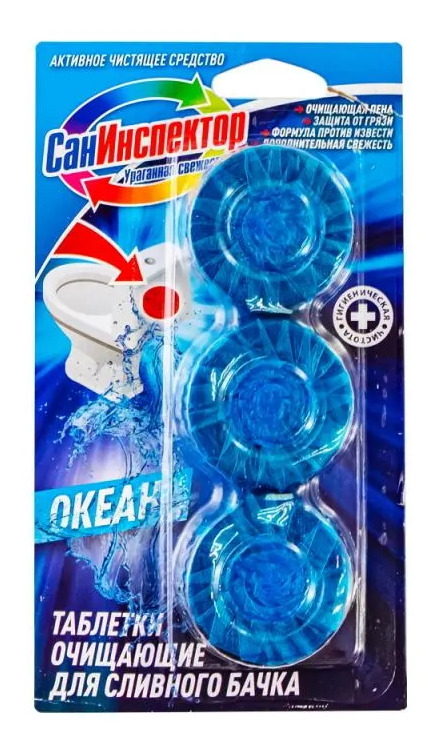 Таблетки очищающие для сливного бачка унитаза СанИнспектор, 3 шт, с ароматом Океан