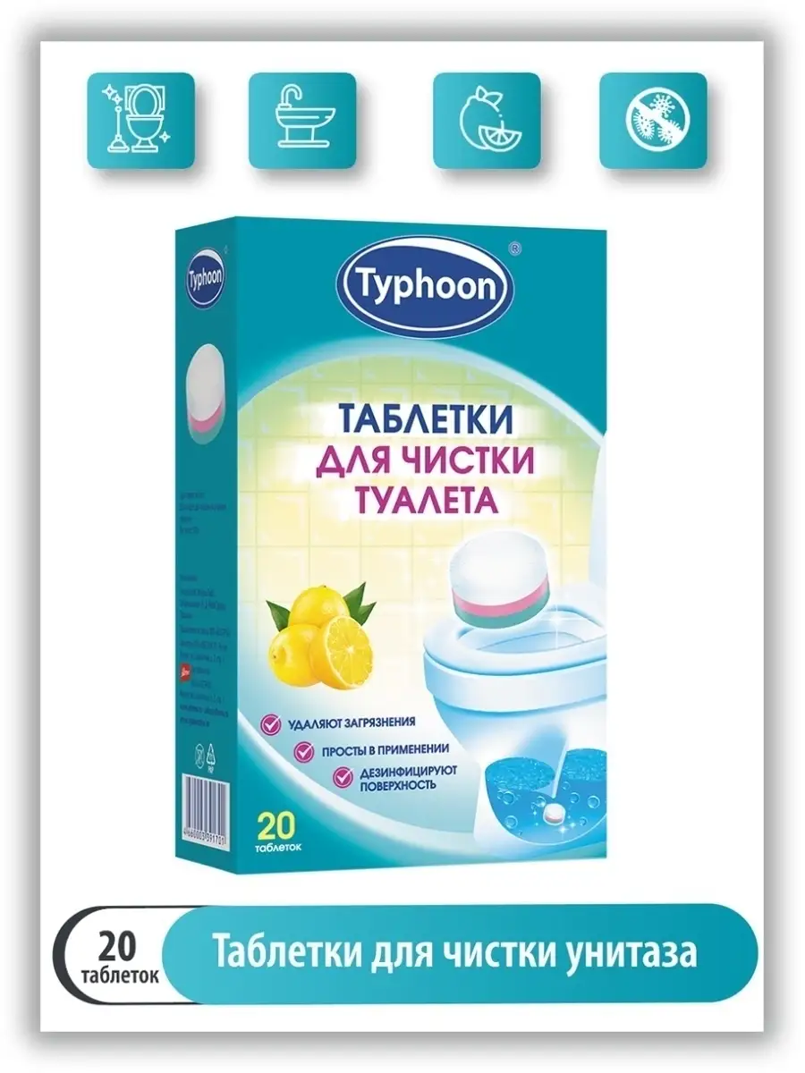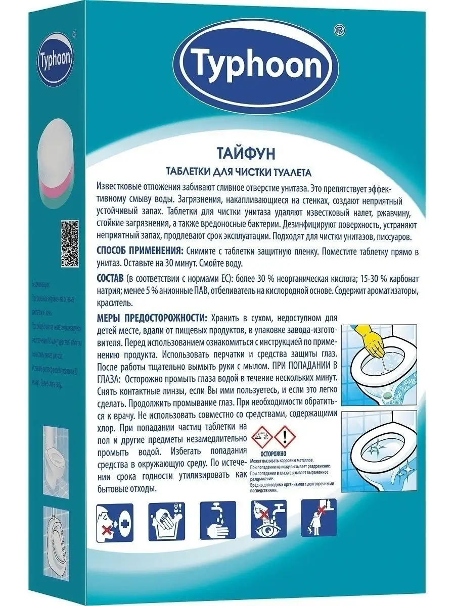 Описание: Известковые отложения забивают сливное отверстие унитаза. Это препятствует эффективному смыву воды. Загрязнения, накапливающиеся на стенках, создают неприятный устойчивый запах.Средство для чистки туалета ТАЙФУН удаляет известковый налет, ржавчину, стойкие загрязнения, а также вредоносные бактерии, дезинфицирует поверхность, устраняет неприятный запах, продлевает срок эксплуатации. Таблетки подходят для чистки унитазов, писсуаров. Просты в применении.