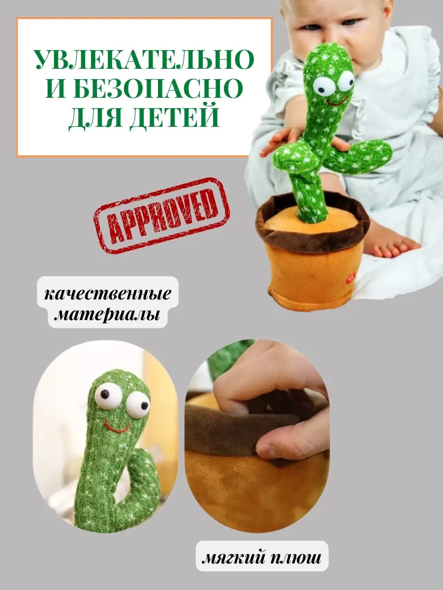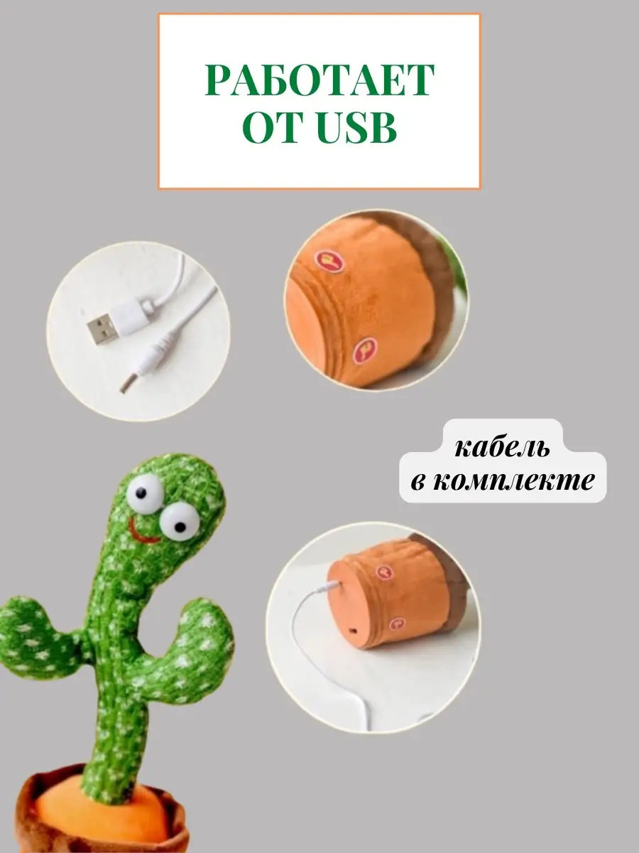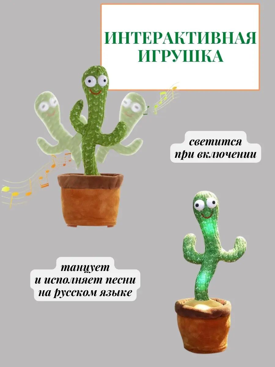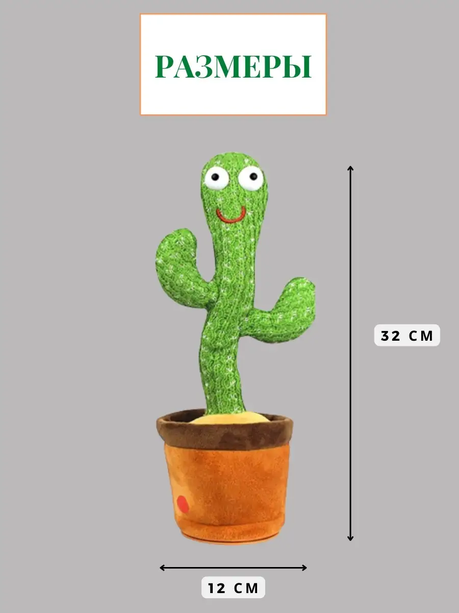 Описание: Танцующий кактус, великолепная и весёлая игрушка, которая порадует своей оригинальностью и создаст хорошее настроение на весь день. Наш танцующий кактус, сделан из гипоаллергенный плюша, приятный на ощупь - игрушка антистресс. Умный кактус, имеет функцию обратной связи и повторяет веселым голосом любые звуки и фразы или режим воспроизведения песен, популярных хитов, при этом музыкальный кактус, танцует и светится. Кактус повторюшка, полностью автономен и работает от аккумулятора (кабель usb в комплекте). Веселый кактус - это интерактивная игрушка, хорошо подойдет для детей любого возраста, всегда способна развлечь их веселыми песнями и танцами или же просто повторением голоса вашего ребенка. Светящийся кактус станет великолепным подарком и для взрослого, ведь он всегда готов к любой вечеринке, поездке за город, на дачу и природу. Порадуйте своих родных и близких незабываемым подарком, развлекательным кактусом и он всегда их будет веселить популярными хитами и жаркими танцами.